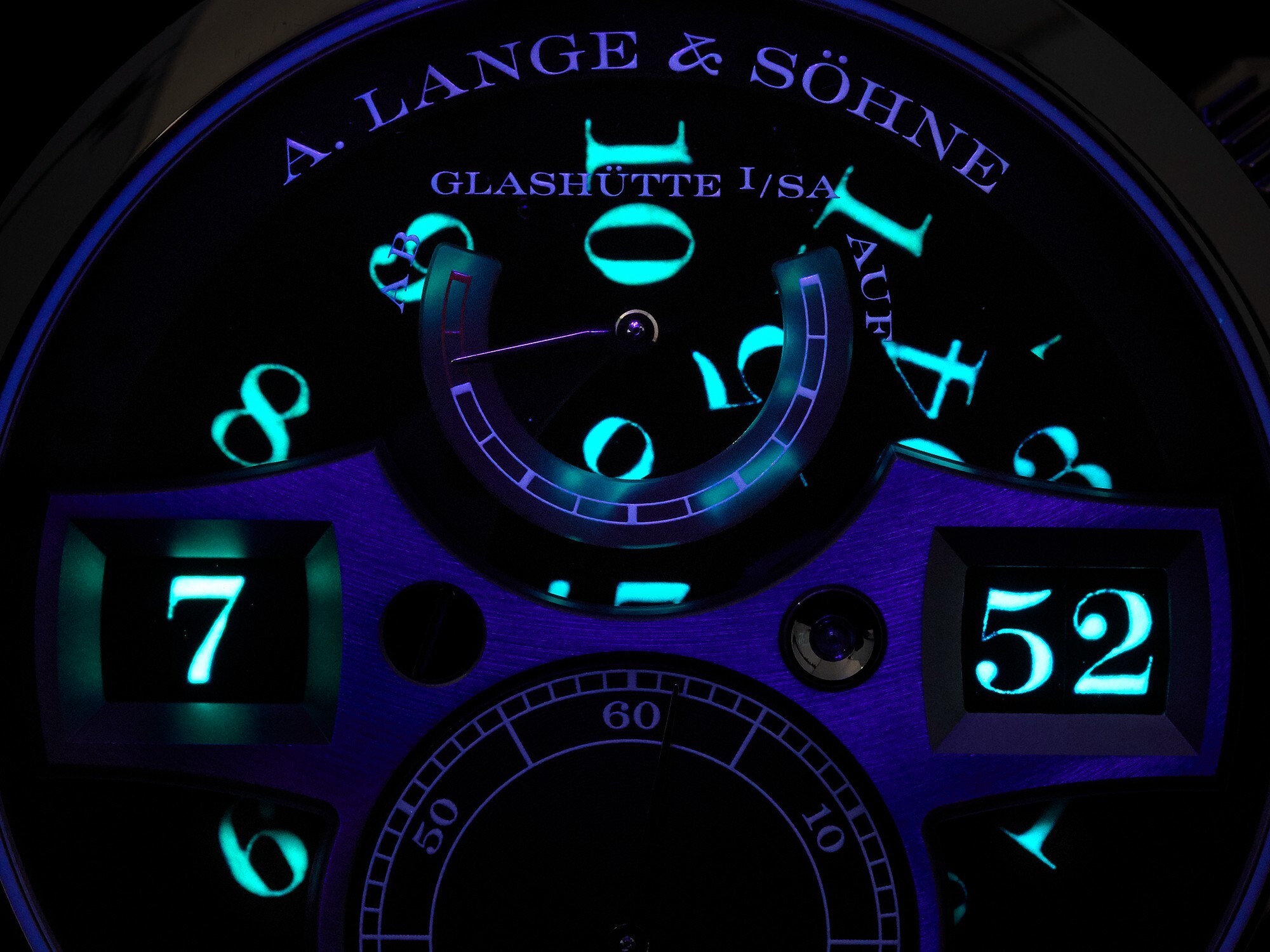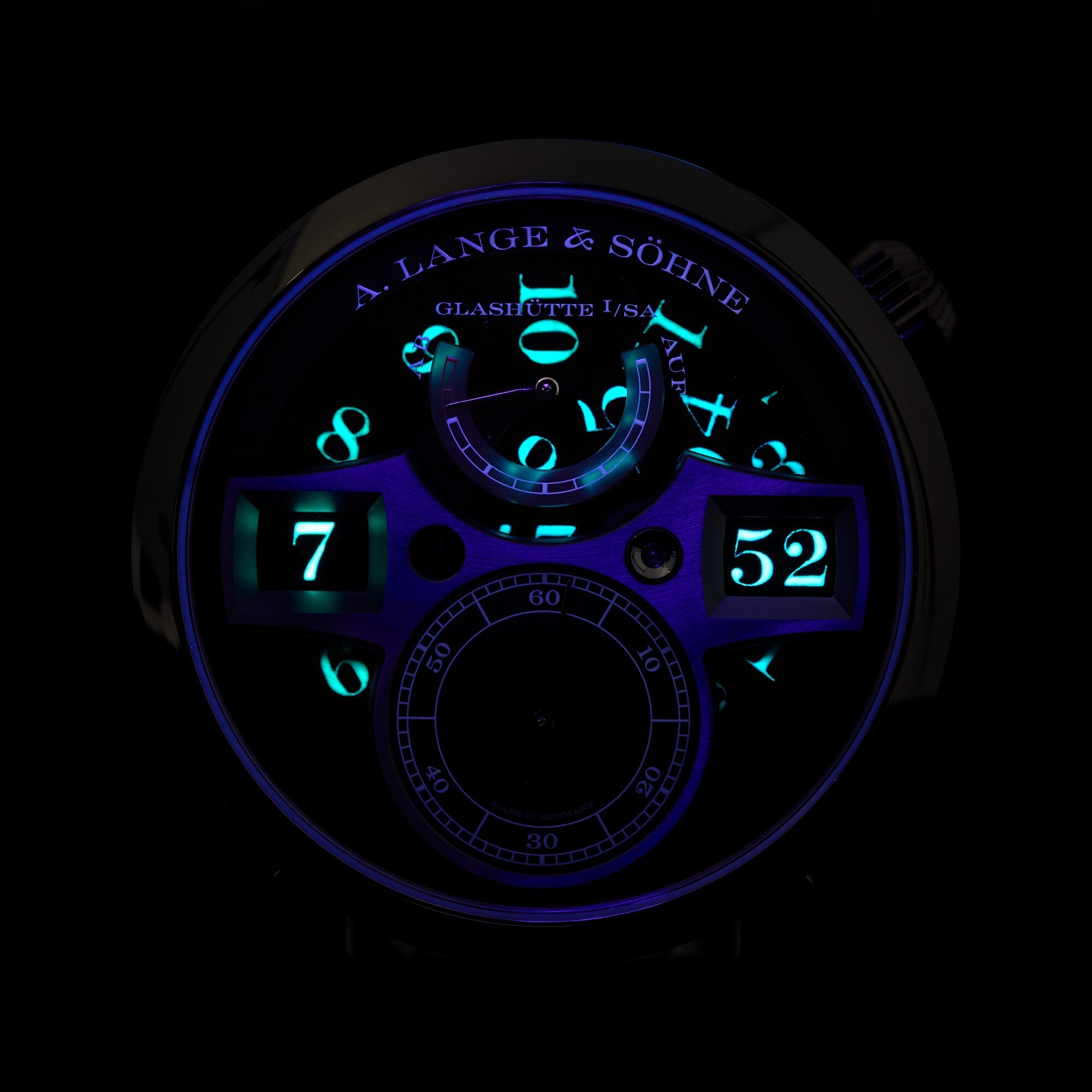 The dial continues the Zeitwerk family’s iconic symmetrical layout. The central curved bridge is made of German silver, while the two large jumping numeral discs on the left and right give the dial its characteristic “Owl” appearance. The up/down power reserve indicator is at 12 o’clock, and the small seconds dial is at 6 o’clock. The dark sapphire crystal dial offers a view of the movement’s operation underneath. The luminous numerals glow with a green light in the dark, adding a touch of intrigue.