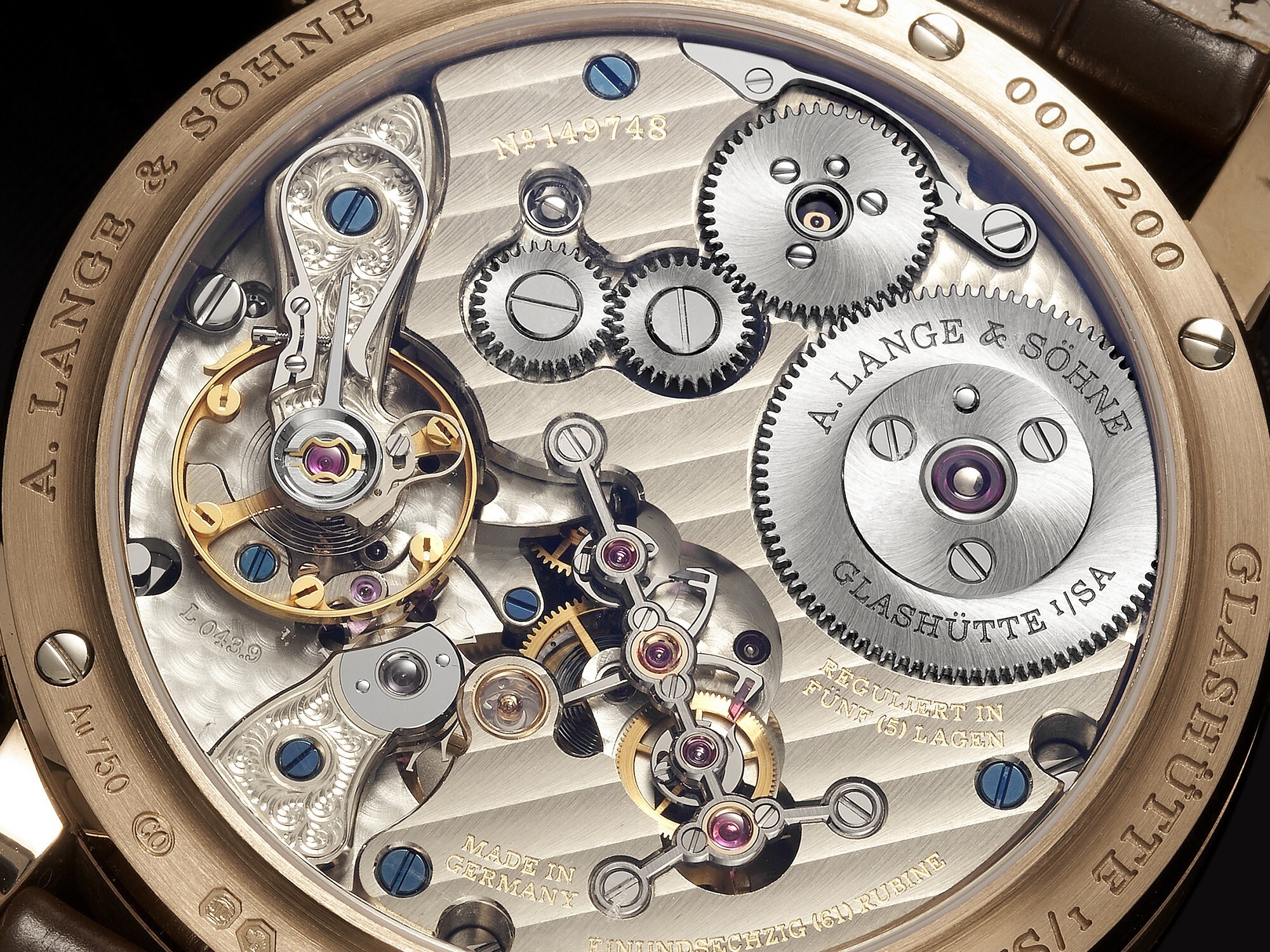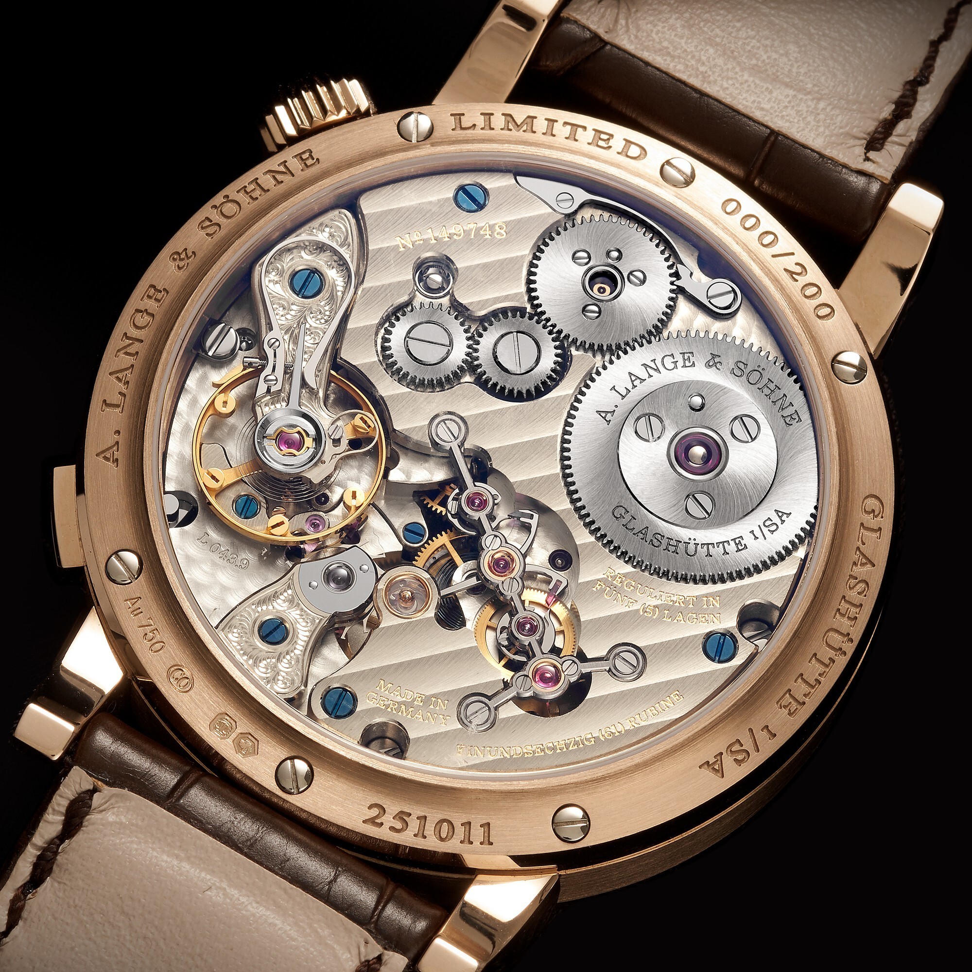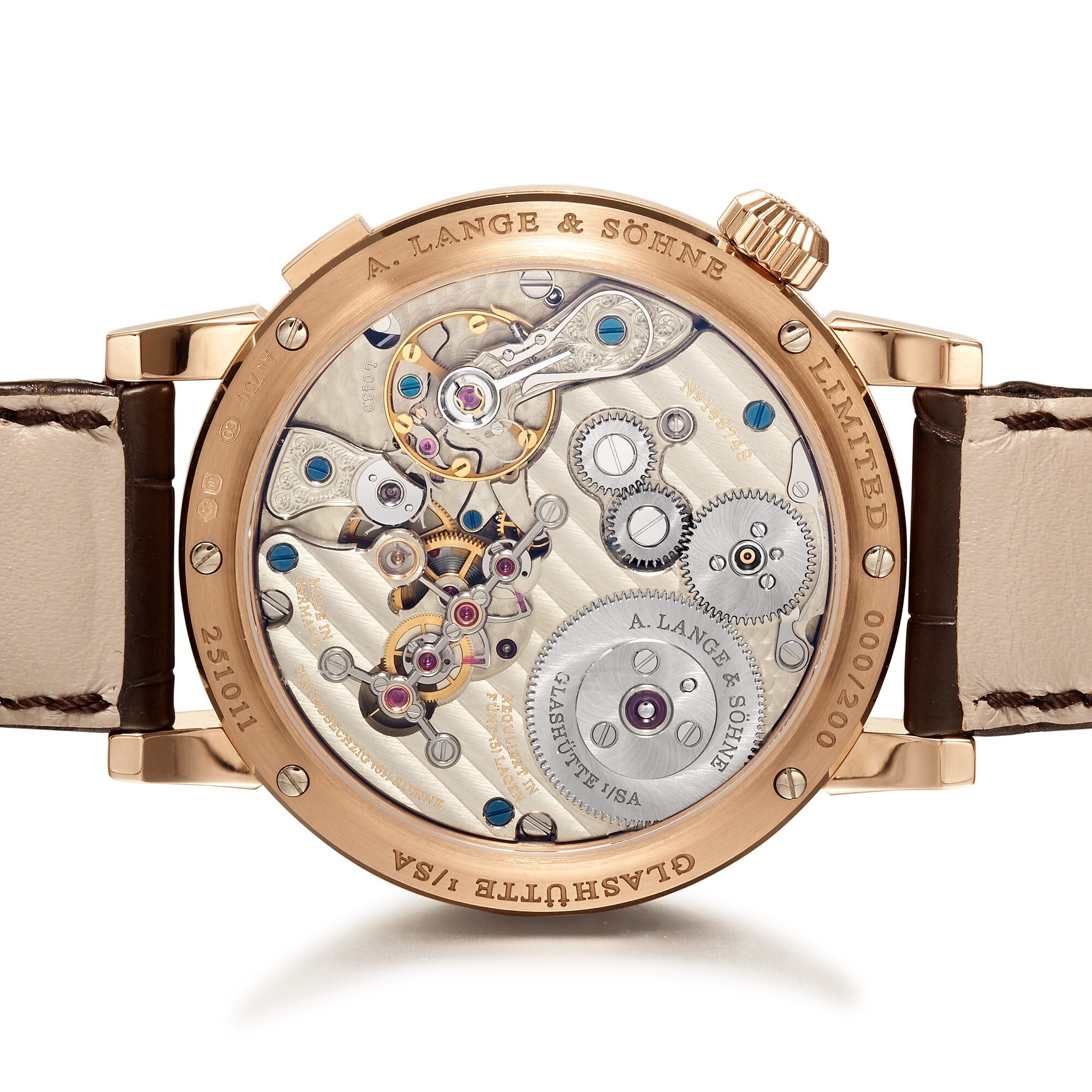 Through the sapphire crystal caseback, one can admire the movement’s exquisite finishing – including ribbing, sunburst, perlée, straight graining, circular graining, mirror polishing, and bevelling. This wealth of detail upholds A. Lange & Söhne’s meticulous standards. The balance cock and the escape wheel cock are both adorned with hand-engraved patterns.