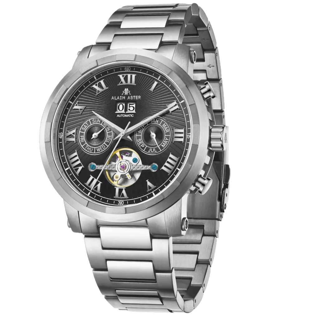This combination of features creates a dial that is both visually rich and mechanically expressive — a core hallmark of the Alain Aster EMPEROR identity.