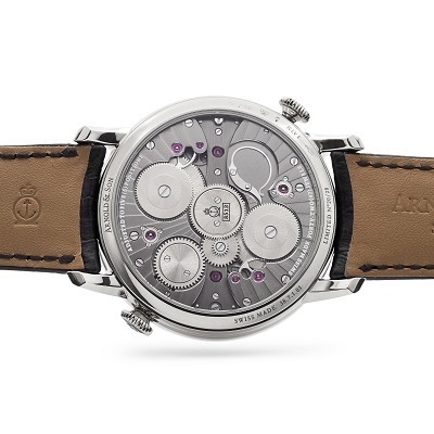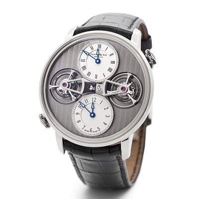 Case: 18K white gold, Diameter: 43 mm, Thickness: 8.35 mm, Sapphire crystal front and back, Silver dial with white lacquer subdials and blued steel hands, Movement: Caliber A&S8513, 42 jewels, Frequency: 21,600 vph,Power reserve: 90 hours, Alligator leather strap with 18K white gold buckle, Water resistance: 30 meters, Functions: Tourbillon, Dual Time (GMT),Limited edition of 28 pieces.