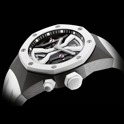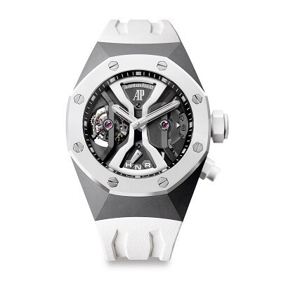 Titanium case, white ceramic bezel, 44mm diameter, skeletonized dial, white gold hands, sapphire crystal front and back, AP 2930 manual-winding movement, 29 jewels, 21,600 vibrations per hour, 237 hours power reserve, white rubber strap, titanium AP folding clasp.