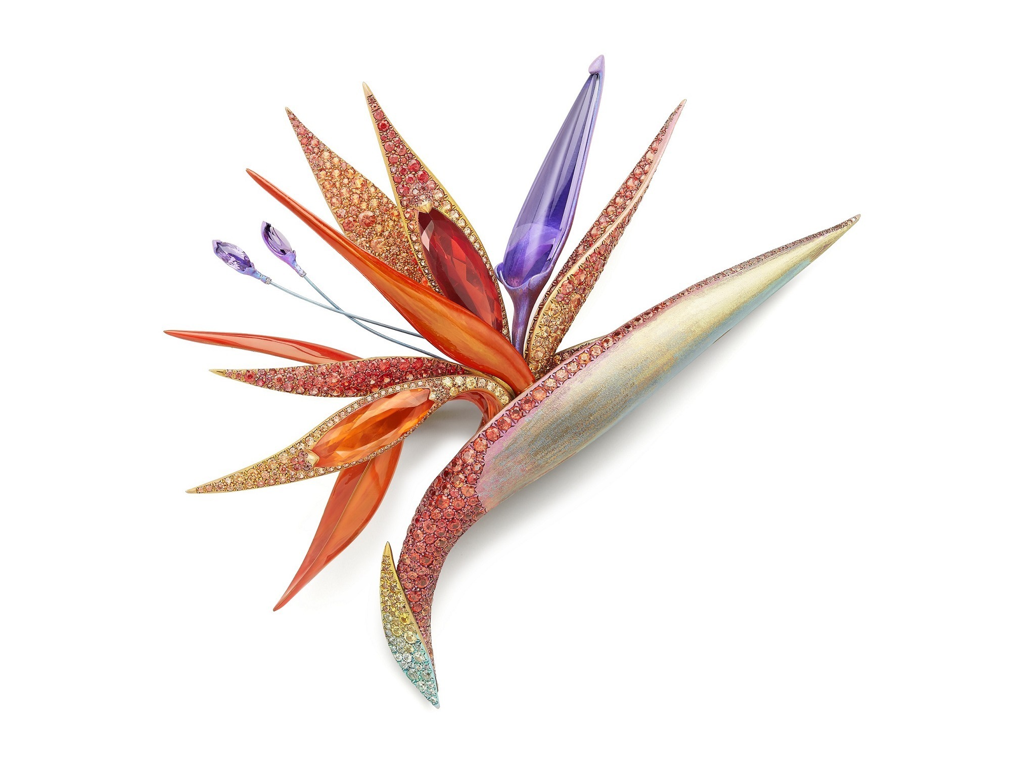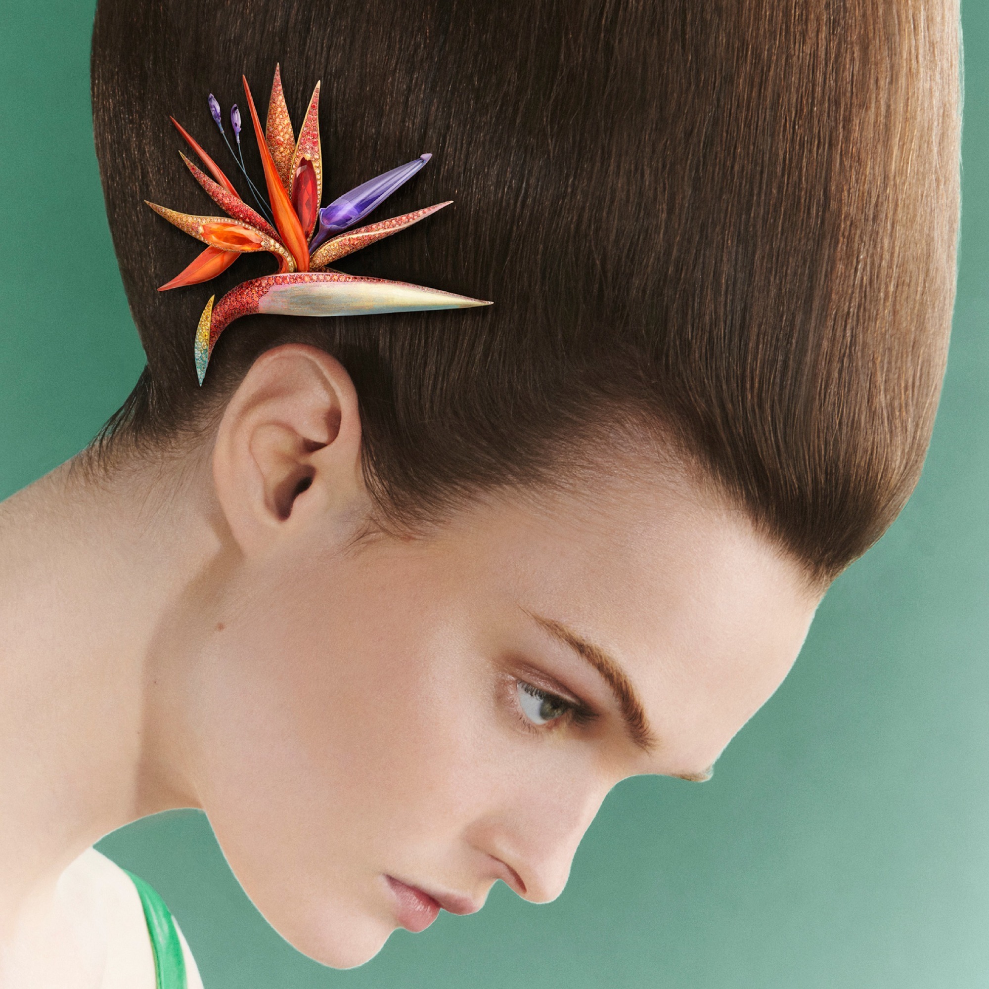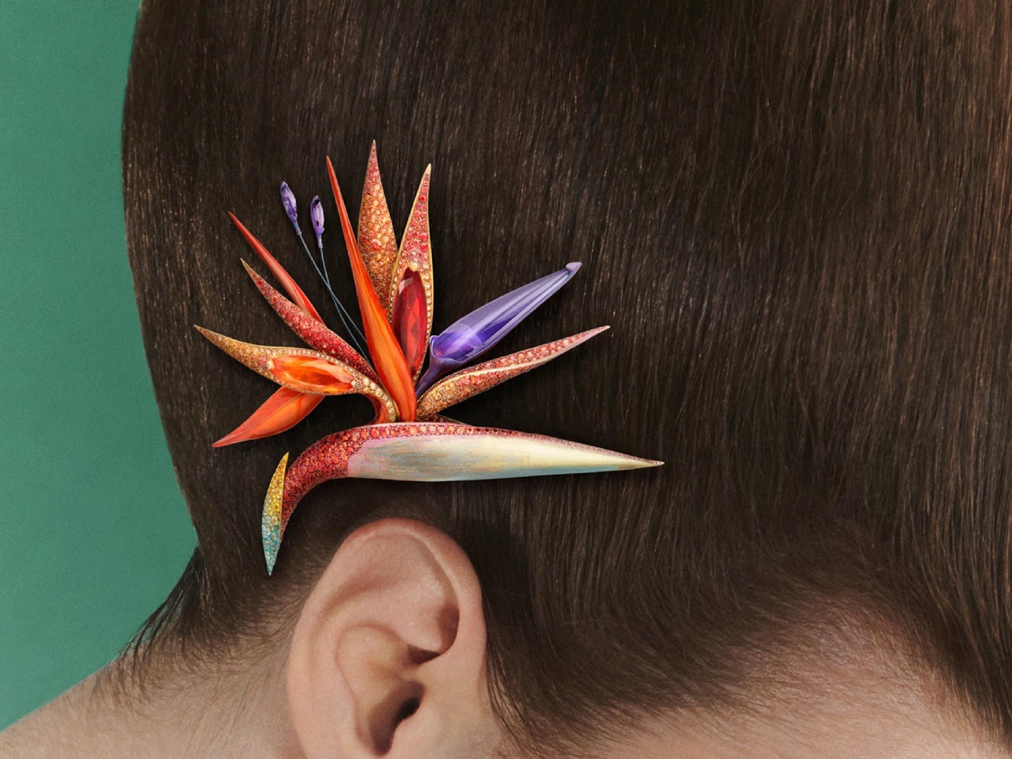 Boucheron unveiled this Fleur de Paradis hair ornament in its 2022 new High Jewelry collection, “Carte Blanche, Ailleurs”. The design draws inspiration from the vibrantly colored tropical flower, the “Bird of Paradise”, skillfully using colored titanium to complement natural gemstones, recreating the flower’s magnificent colors and texture.