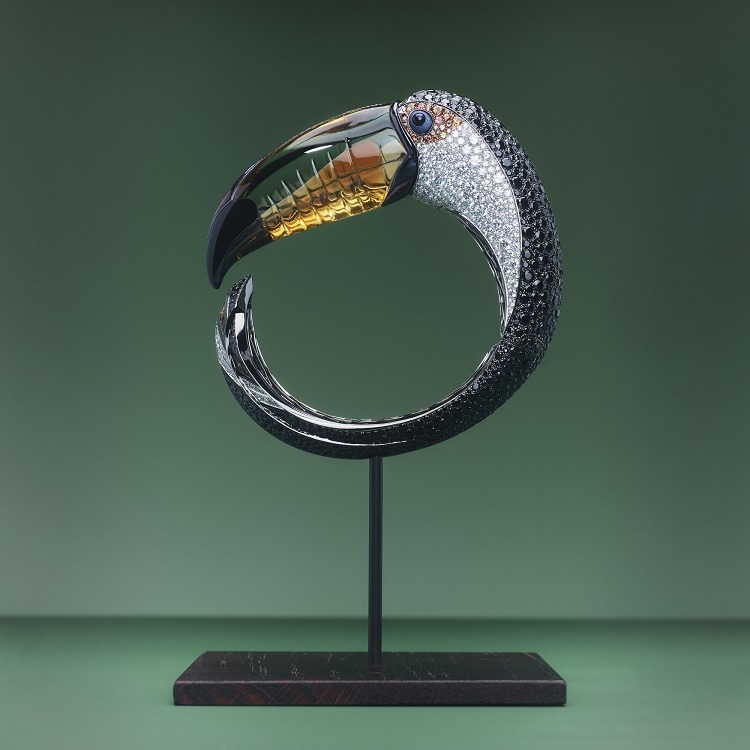 The entire bracelet is crafted from white gold, with the semi-open bracelet band extending at both ends to form the toucan’s head and tail. The main body of the bracelet employs a two-tone design: