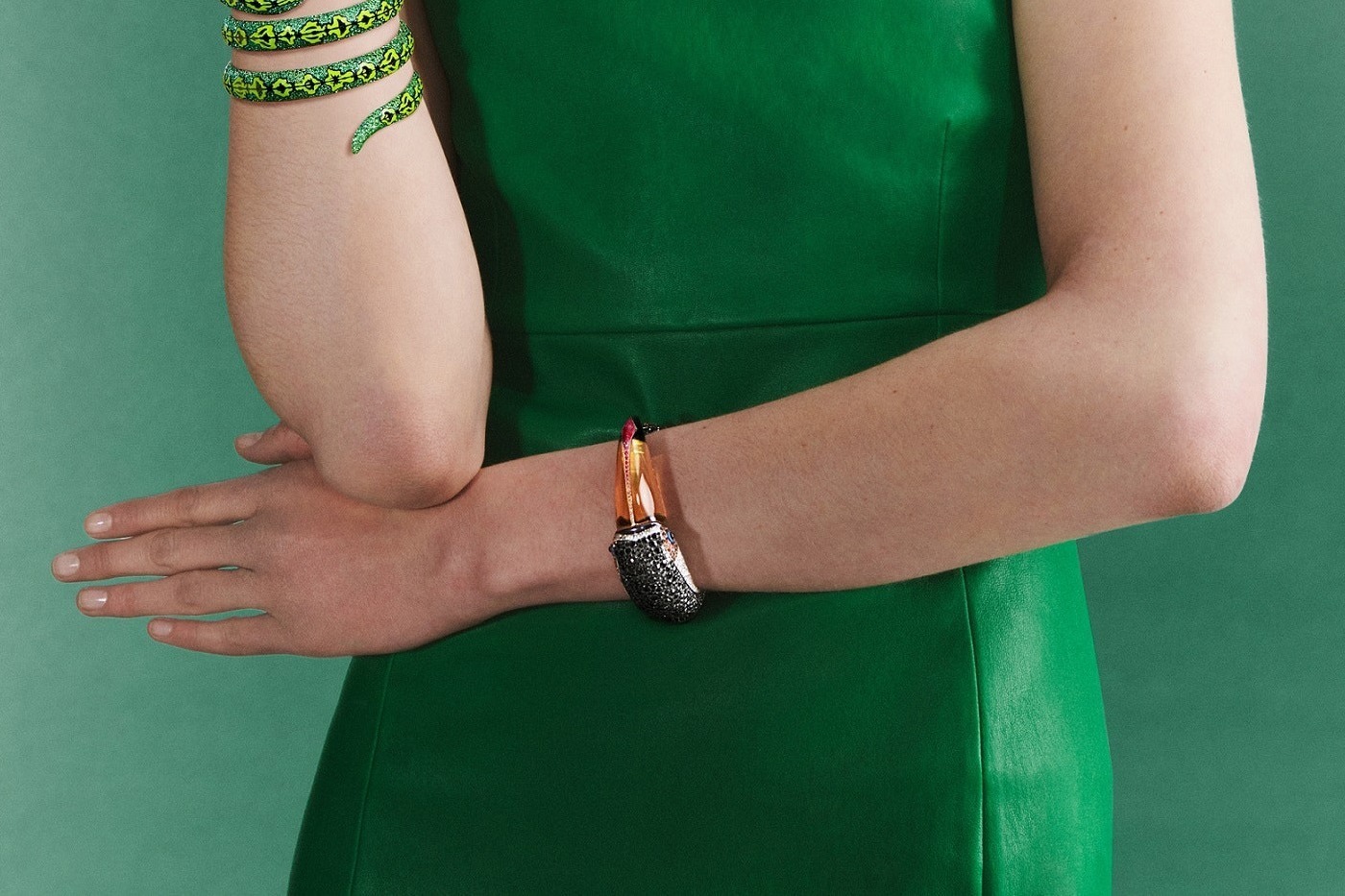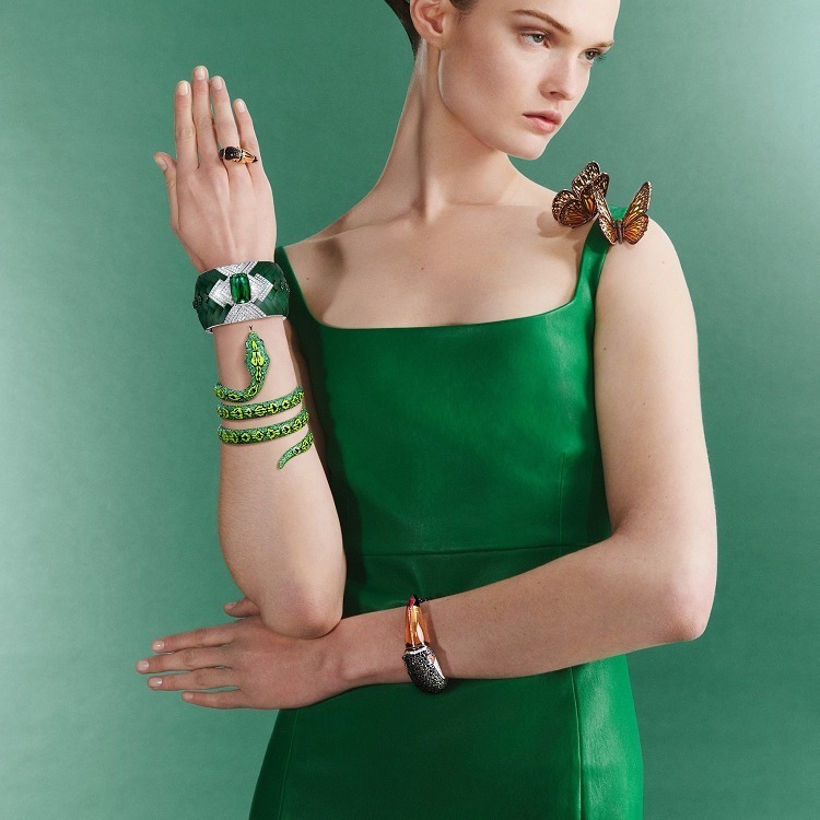 This strikingly styled bracelet is from Boucheron’s 2022 new high jewelry collection “Carte Blanche, Ailleurs.” The designer drew inspiration from the “toucan” inhabiting tropical rainforests, boldly combining rock crystal, diamonds, colored gemstones, and electroplated titanium to faithfully recreate the bird’s brilliant plumage.