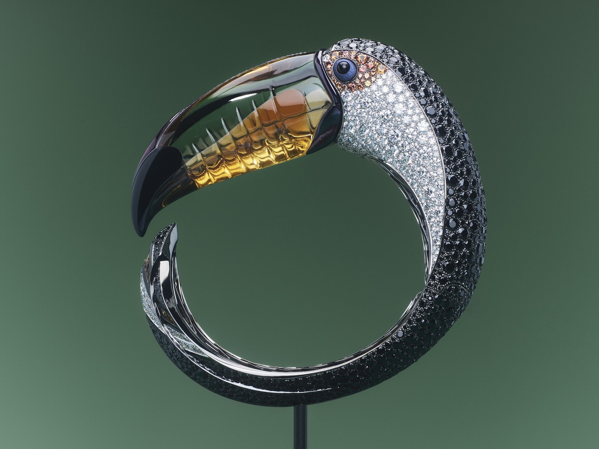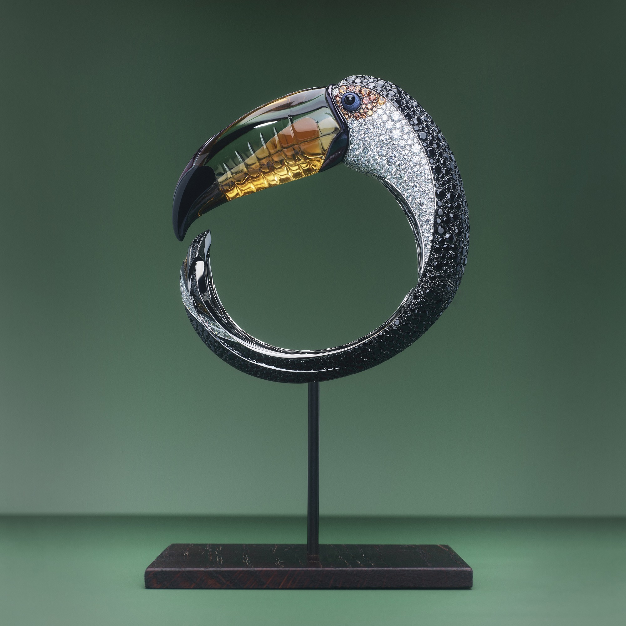 • The toucan’s snow-white neck feathers are set with white diamonds using the snow setting technique.