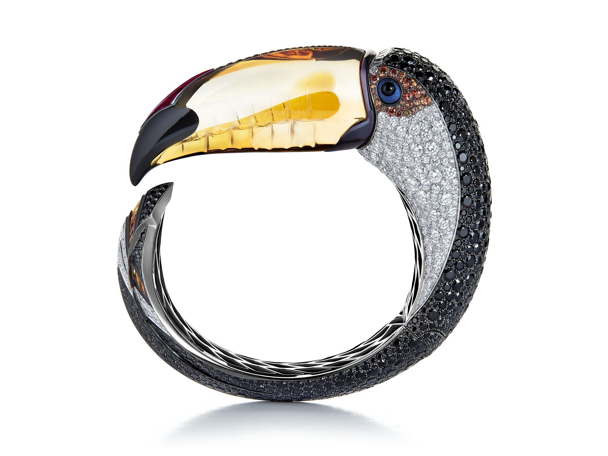 The tail feathers are rendered abstractly. The designer alternately uses black spinels, diamonds, and citrine to create layered feathers that blend seamlessly with the bracelet band.