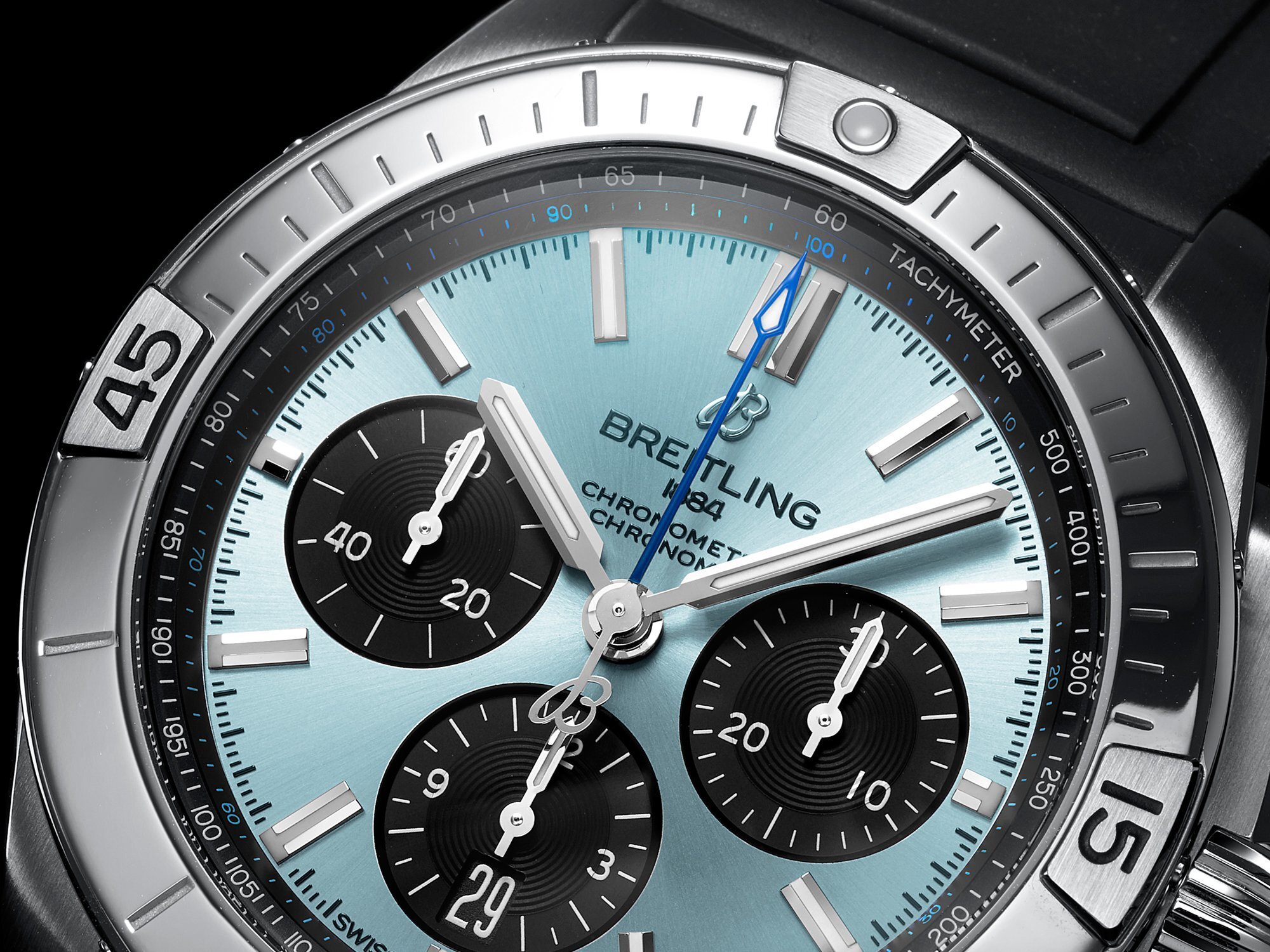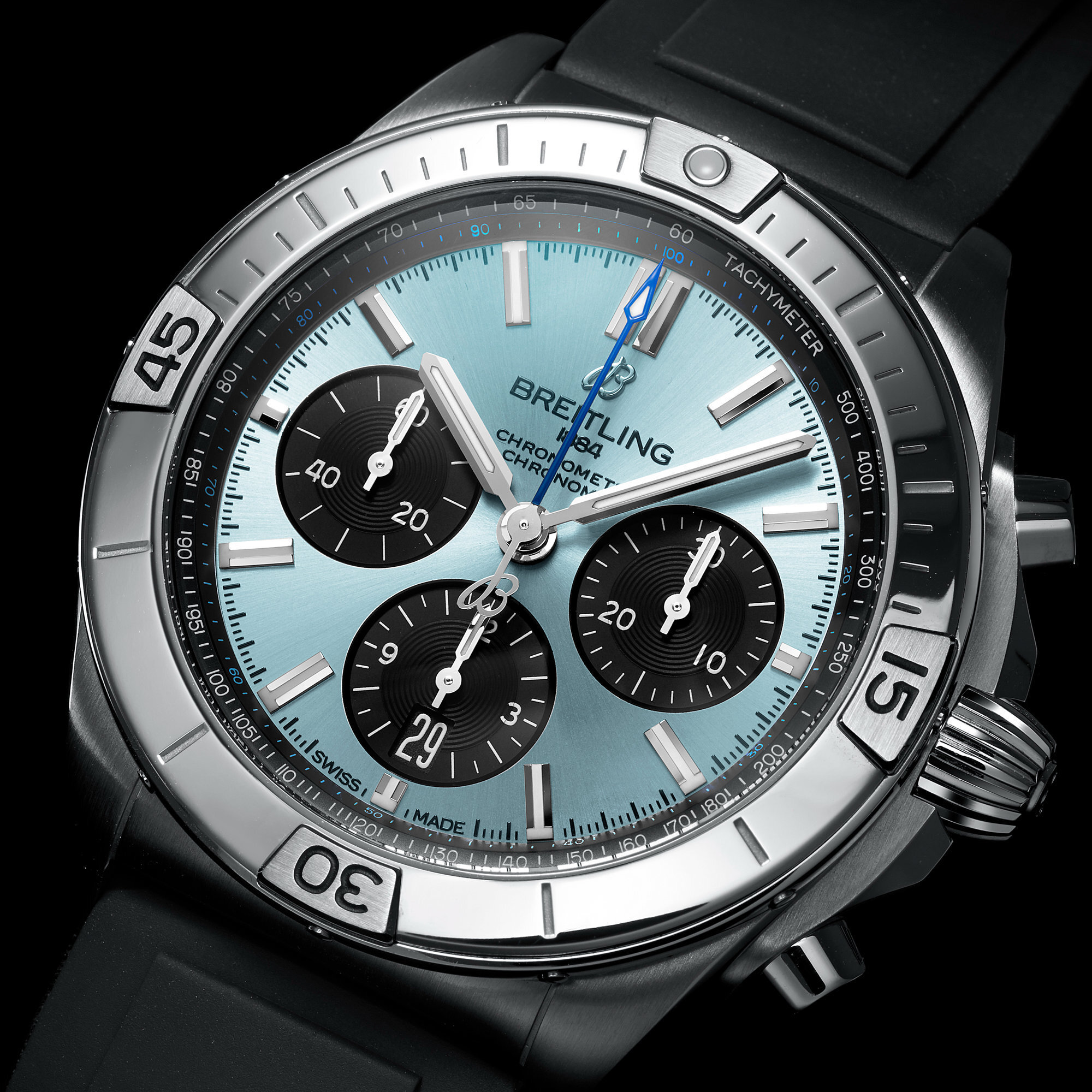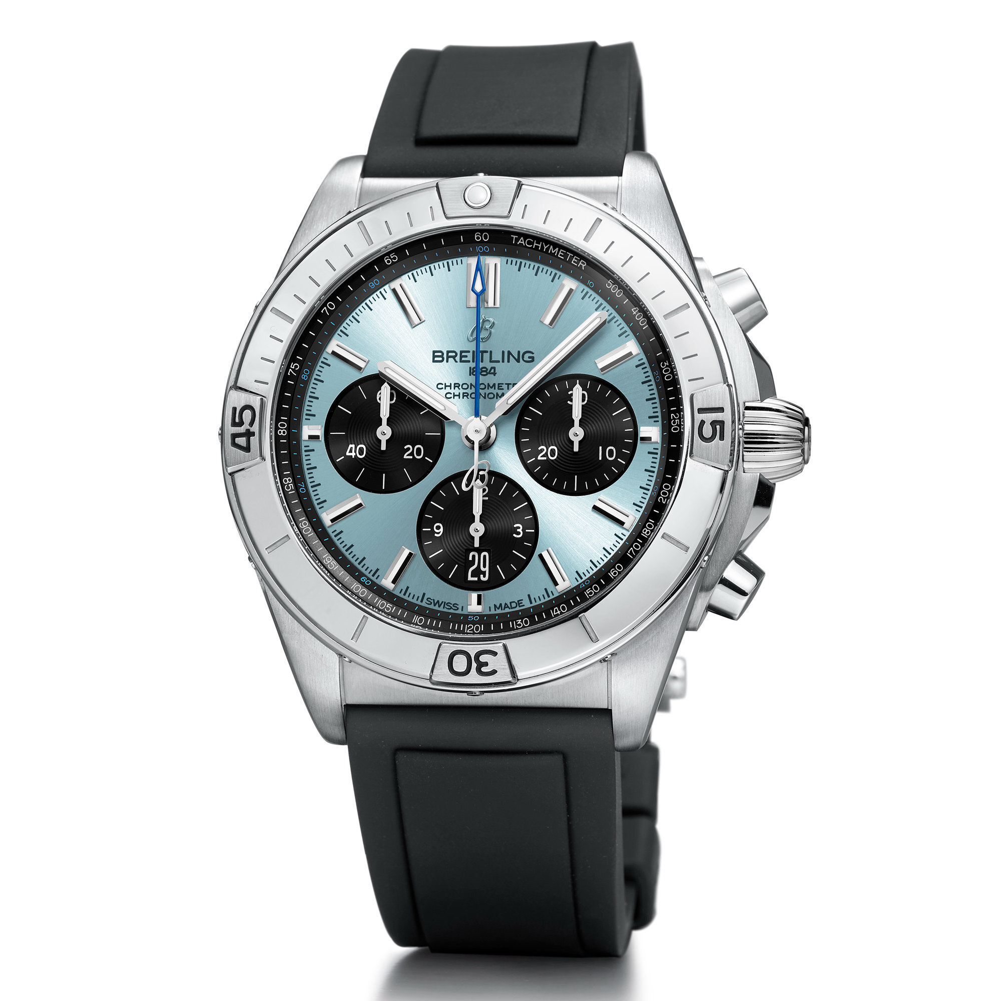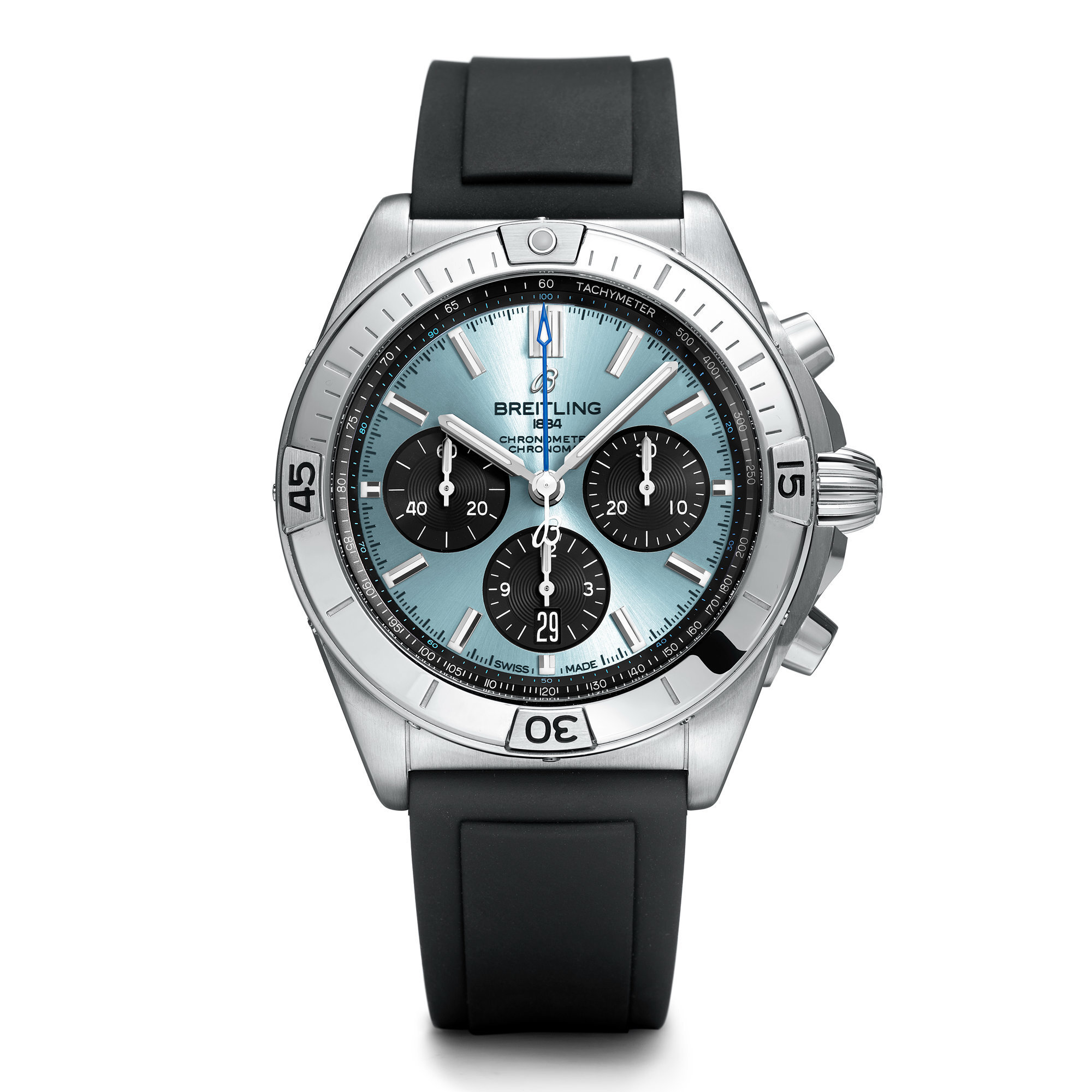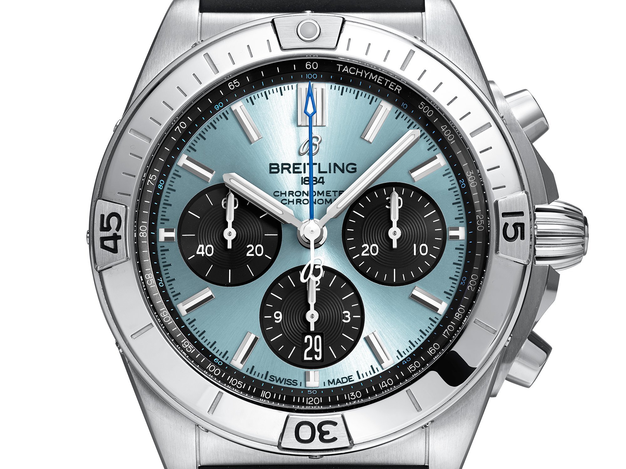 The ice-blue dial is finished with a sunburst pattern, and features black subdials arranged in Breitling’s signature 3-6-9 layout — a 30-minute counter at 3 o’clock, a 12-hour counter and date window at 6 o’clock, and a small seconds subdial at 9 o’clock. The central chronograph seconds hand is rendered in blue, harmonizing with the main dial tone. A tachymeter scale runs along the outer edge for precise speed measurement.