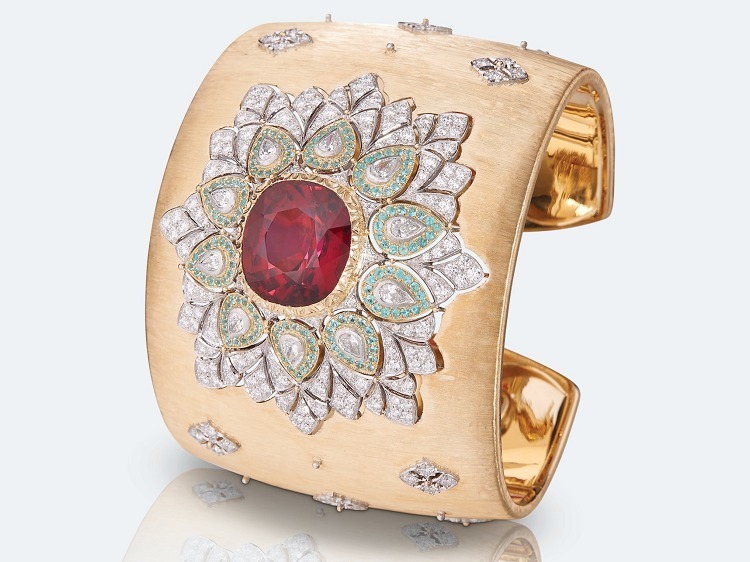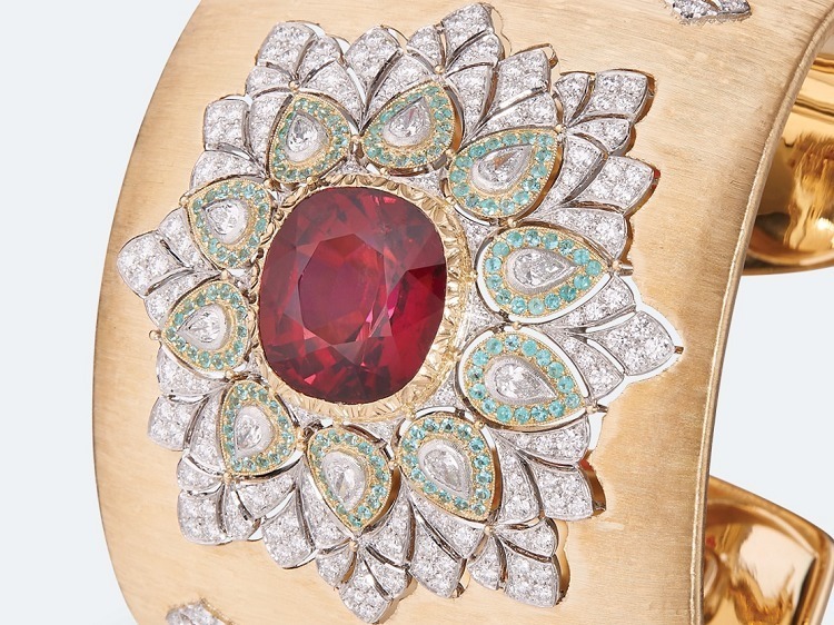 Stepping into the Giardino collection is like entering a brilliantly colored flower bed. The Dans du Fau bracelet takes the “rose” as its motif, featuring an 18.52ct cushion-cut red tourmaline at its heart, representing the flower’s center. This is surrounded by petal-like settings of electrifying blue Paraíba tourmalines in teardrop cuts. Outward-pointing, sharp-edged petals are outlined in white gold and diamonds, with the vivid colors creating a rich visual depth.