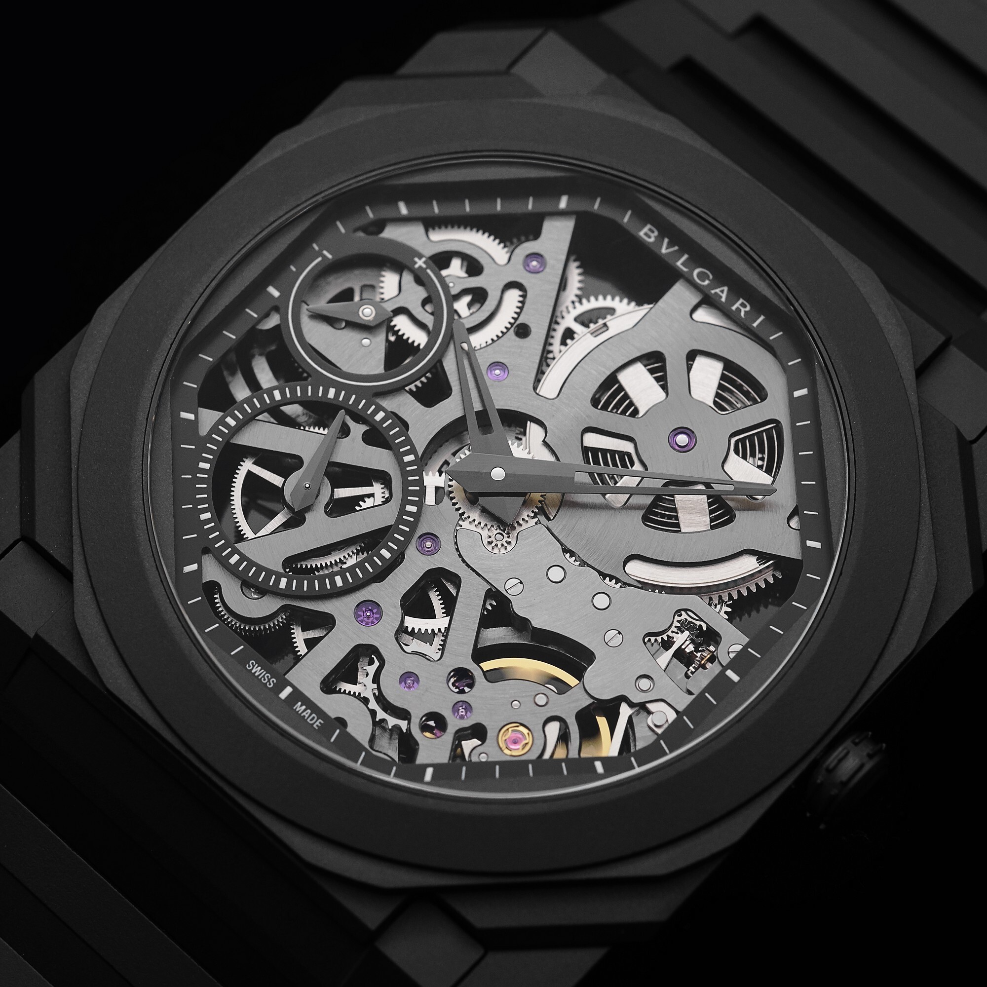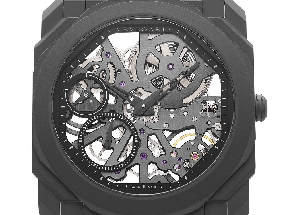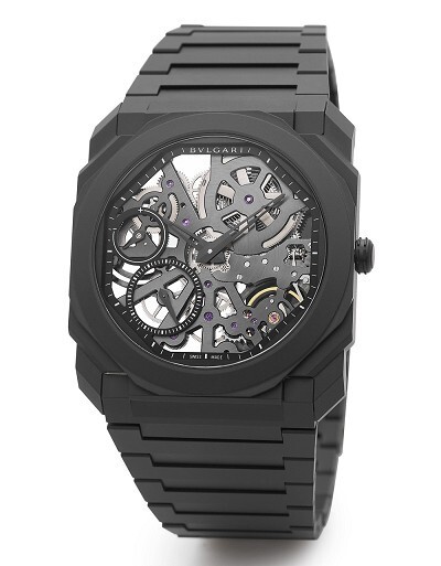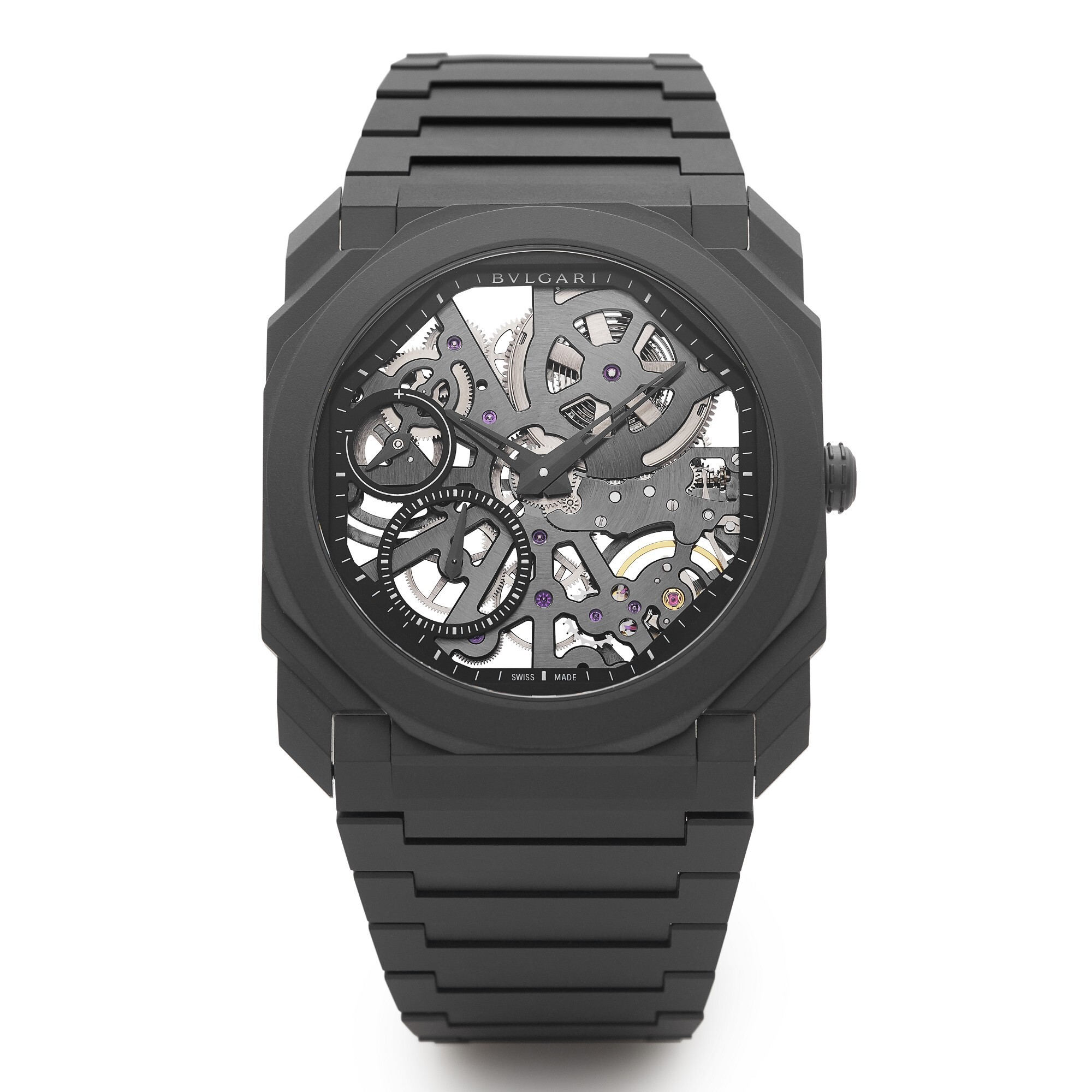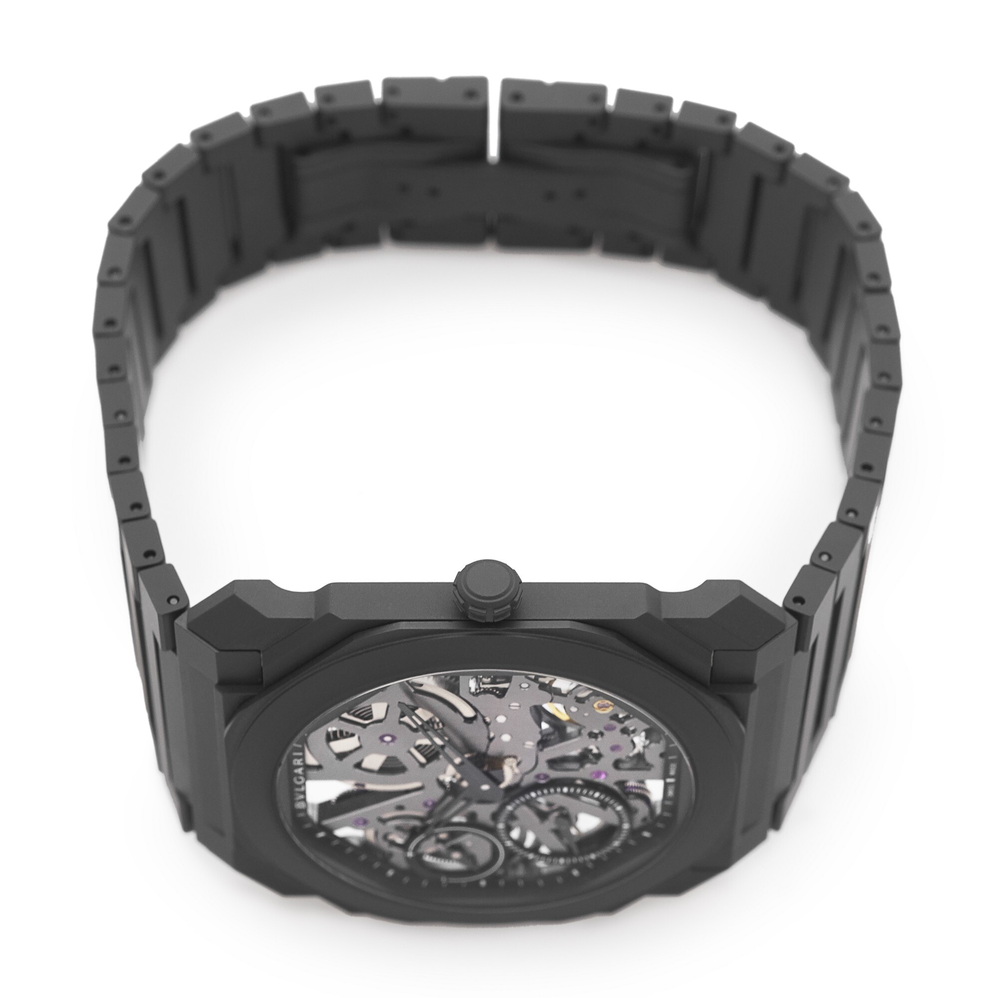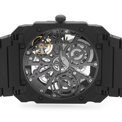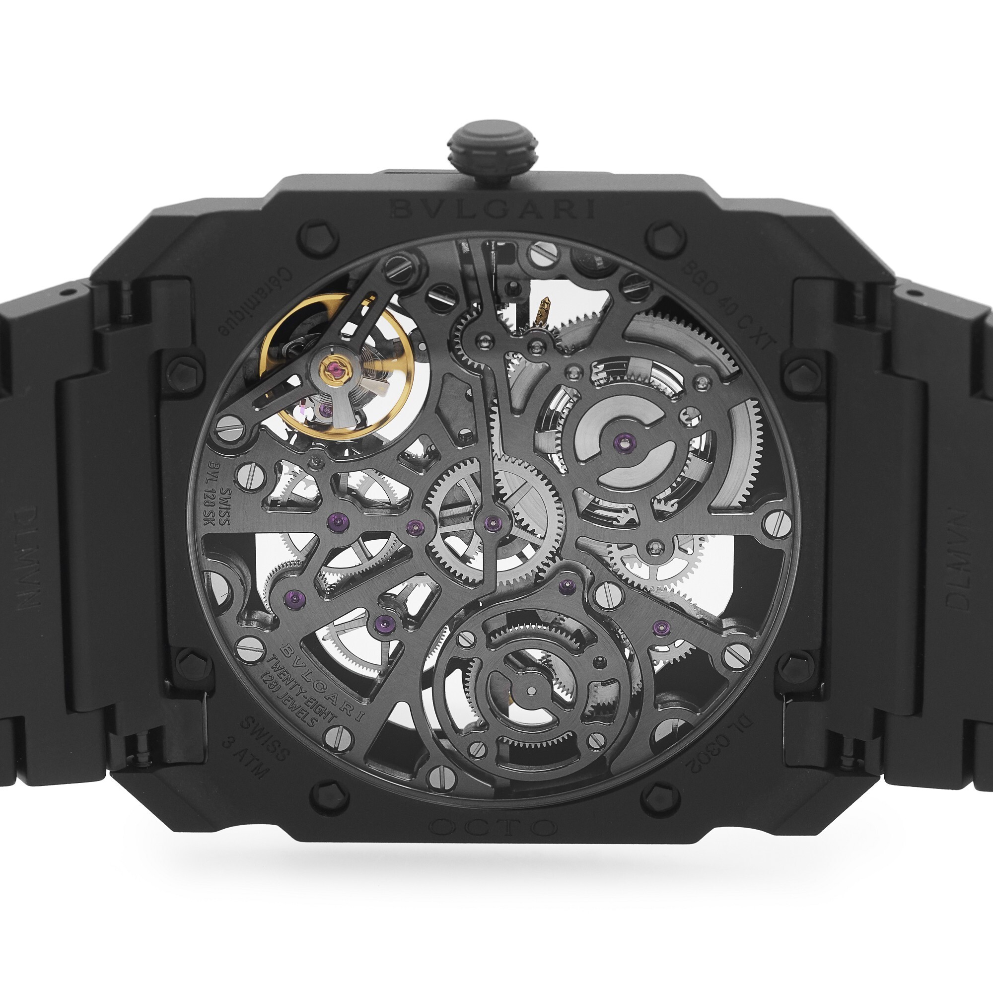 Bulgari Octo Finissimo Skeleton Ceramic Ultra-Thin WatchCase: Black sandblasted ceramic, Diameter: 40 mm, Thickness: 5.5 mm,Crystal: Sapphire (front and back), Crown: Ceramic,Dial: Openworked,Movement: Bulgari Caliber BVL 128SK, hand-wound skeleton movement, Power Reserve: 65 hours,Bracelet: Black sandblasted ceramic, Clasp: Folding clasp, Water Resistance: 30 meters.