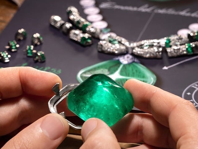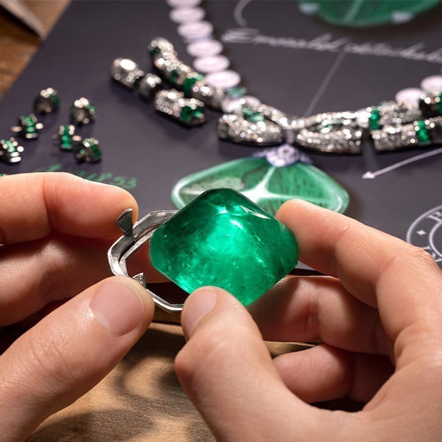 Certified as of Colombian origin, the sugarloaf-cut magnifies the deep, vivid green of the exceptional emerald. It is secured by two diamond-accented claws, while the platinum setting remains nearly invisible, allowing the gemstone’s natural power to take center stage.