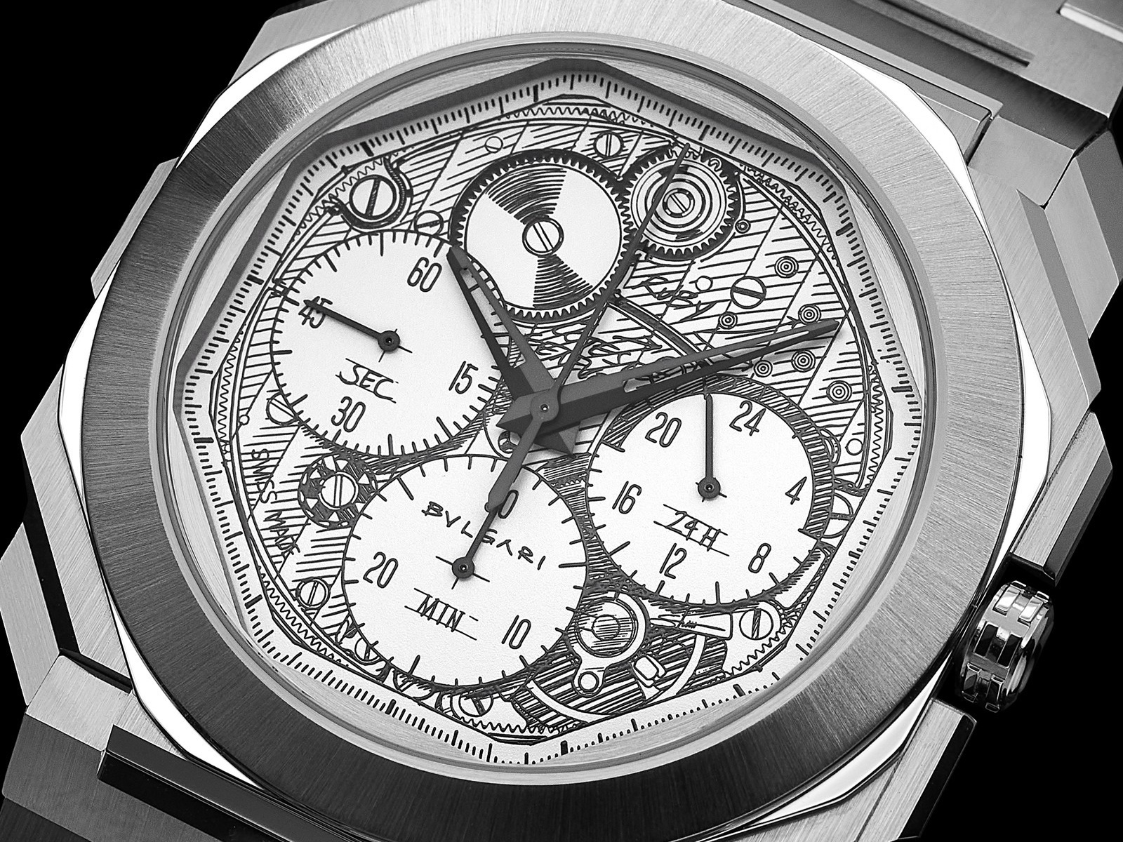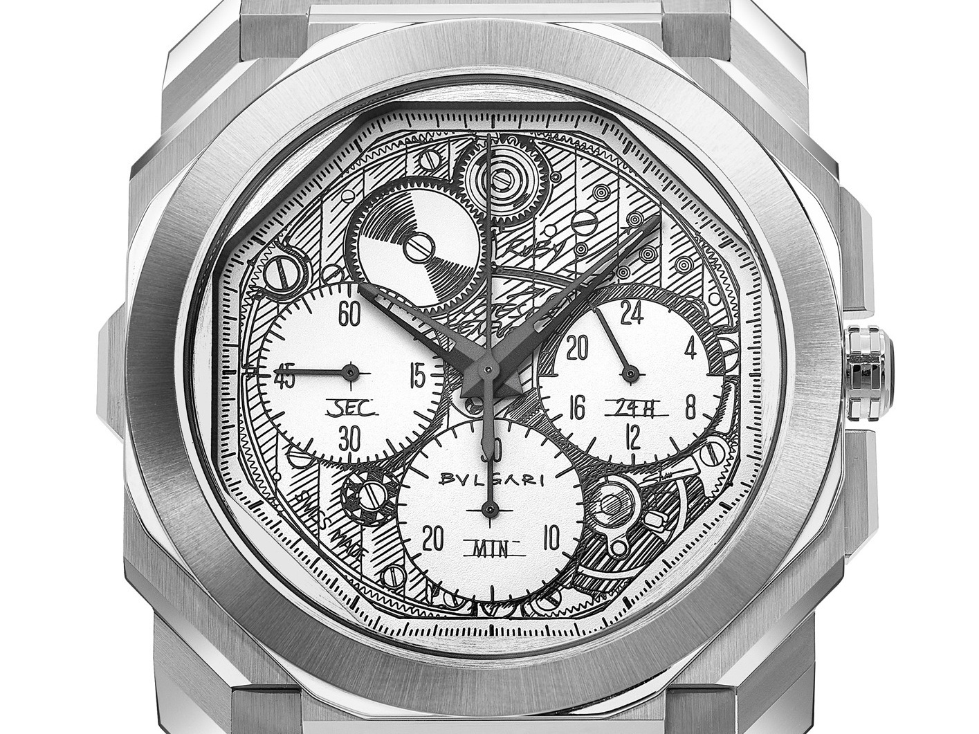 This ultra-thin chronograph GMT by Bvlgari was launched to celebrate the brand’s 140th anniversary. The dial is decorated with the hand-sketch of the BVL 318 ultra-thin movement by the brand’s Creative Director Fabrizio Buonamassa Stigliani, as a tribute to enduring design passion.