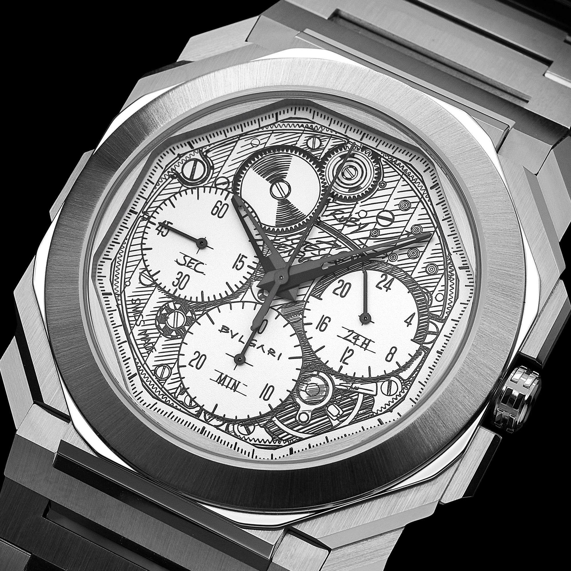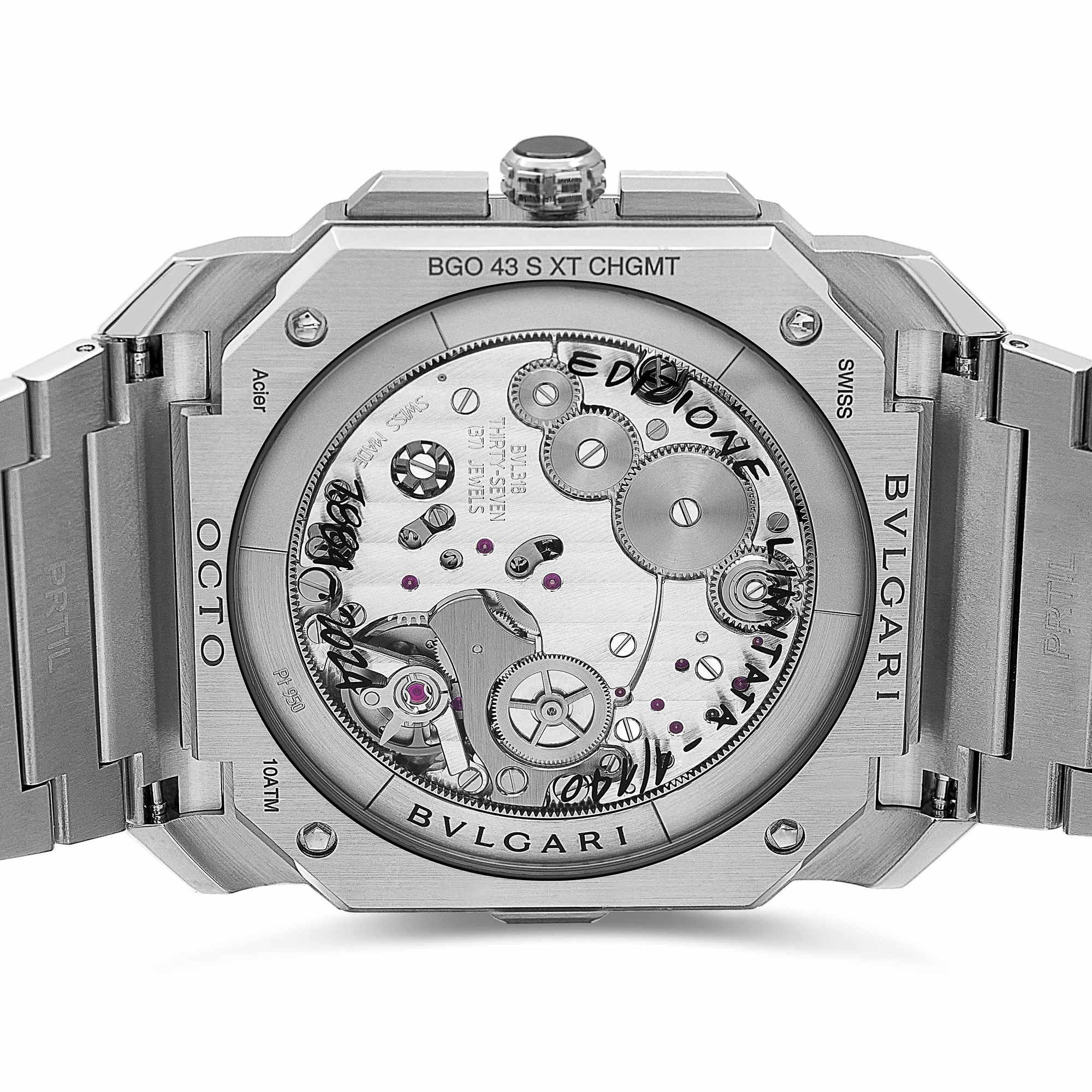 The 43 mm stainless steel case continues the Octo Finissimo’s signature octagonal geometry, with a thickness of only 8.75 mm. Its surfaces feature alternating mirror-polish, circular and radiating brushing, and vertical drawing finishes to present a richly three-dimensional play of light. A screw-down crown inlaid with ceramic provides 100 m water resistance.