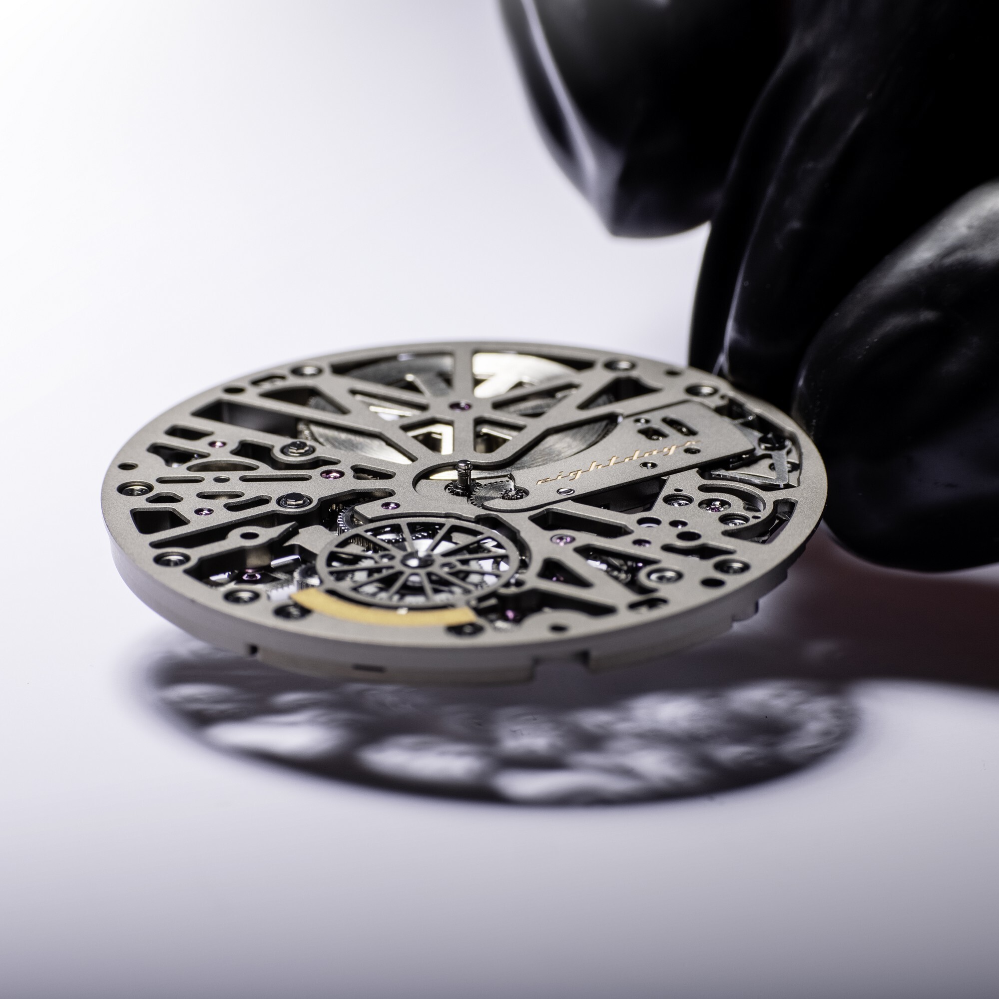 The openworked dial features an intuitive small seconds layout at 7 o’clock, which also incorporates the power reserve indicator. The edge of the openworked small seconds sub-dial is a golden segment. As the mainspring’s power depletes, this small seconds sub-dial rotates slowly counter-clockwise. The golden segment gradually disappears beneath the dial’s flange until only the openworked brown frame remains, indicating that the mainspring is fully discharged and requires immediate winding.