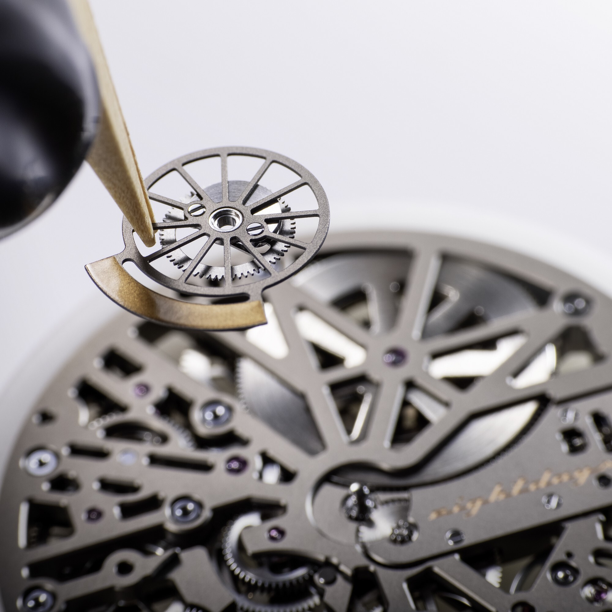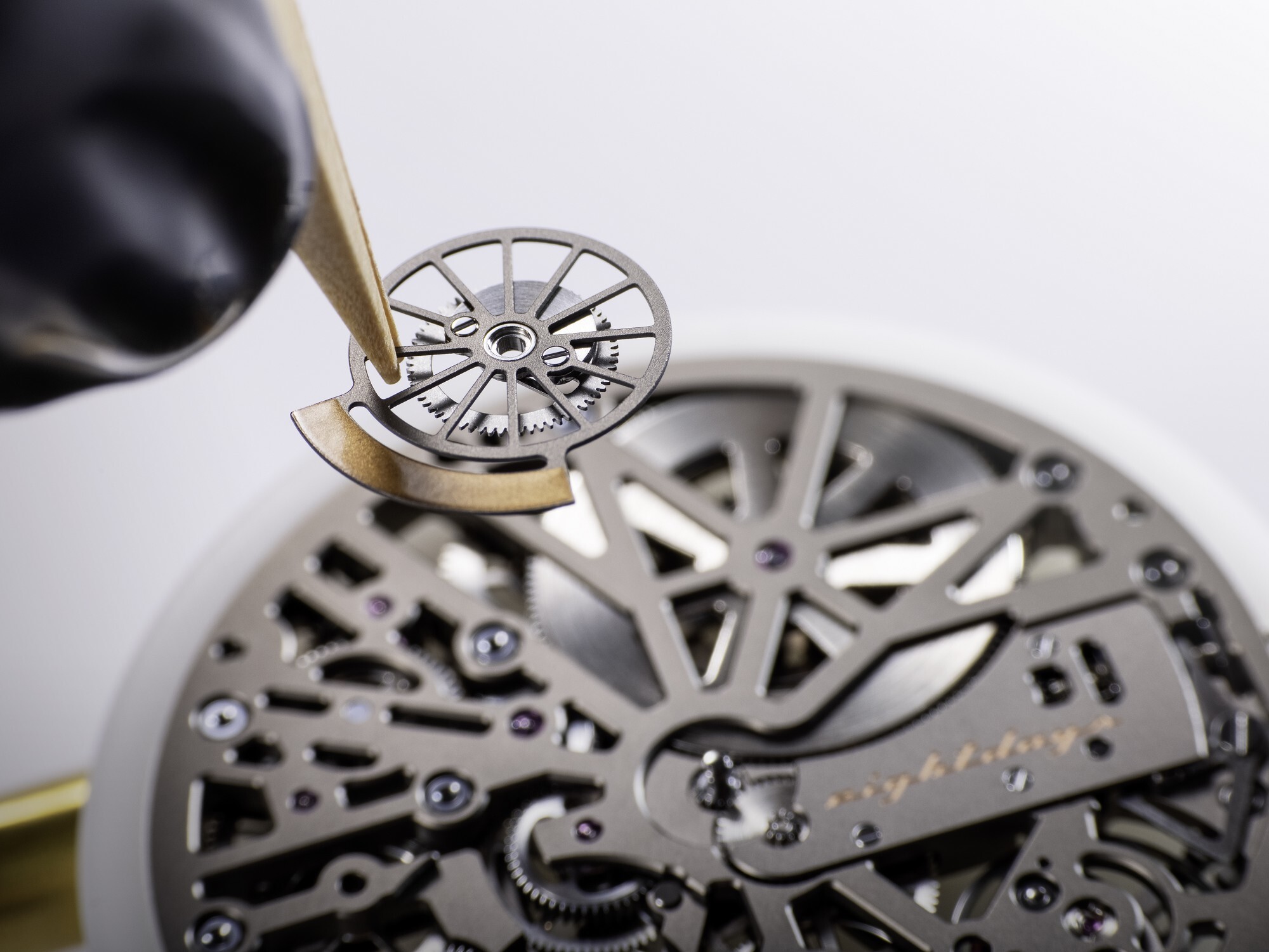 The openworked dial features an intuitive small seconds layout at 7 o’clock, which also incorporates the power reserve indicator. The edge of the openworked small seconds sub-dial is a golden segment. As the mainspring’s power depletes, this small seconds sub-dial rotates slowly counter-clockwise. The golden segment gradually disappears beneath the dial’s flange until only the openworked brown frame remains, indicating that the mainspring is fully discharged and requires immediate winding.