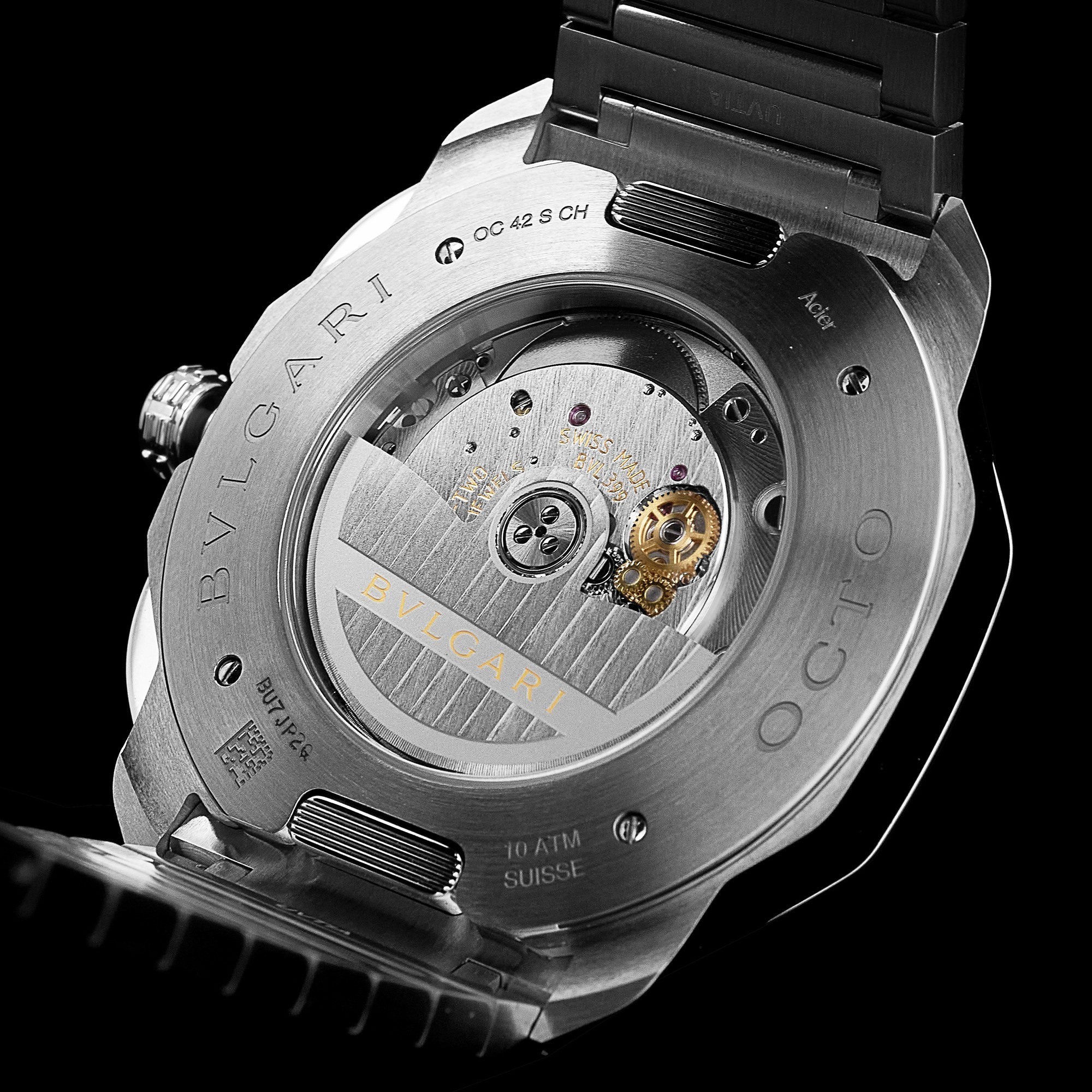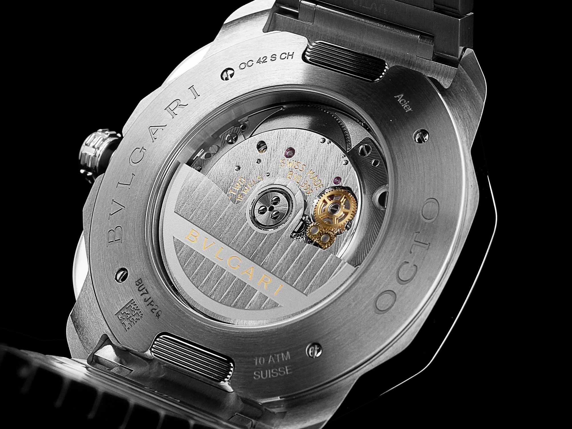 Powered by the new BVL 399 self-winding movement, it operates at 28,800 vibrations per hour and provides a 42-hour power reserve. The sapphire crystal case back reveals the oscillating weight and bridges decorated with Côtes de Genève (Geneva stripes).