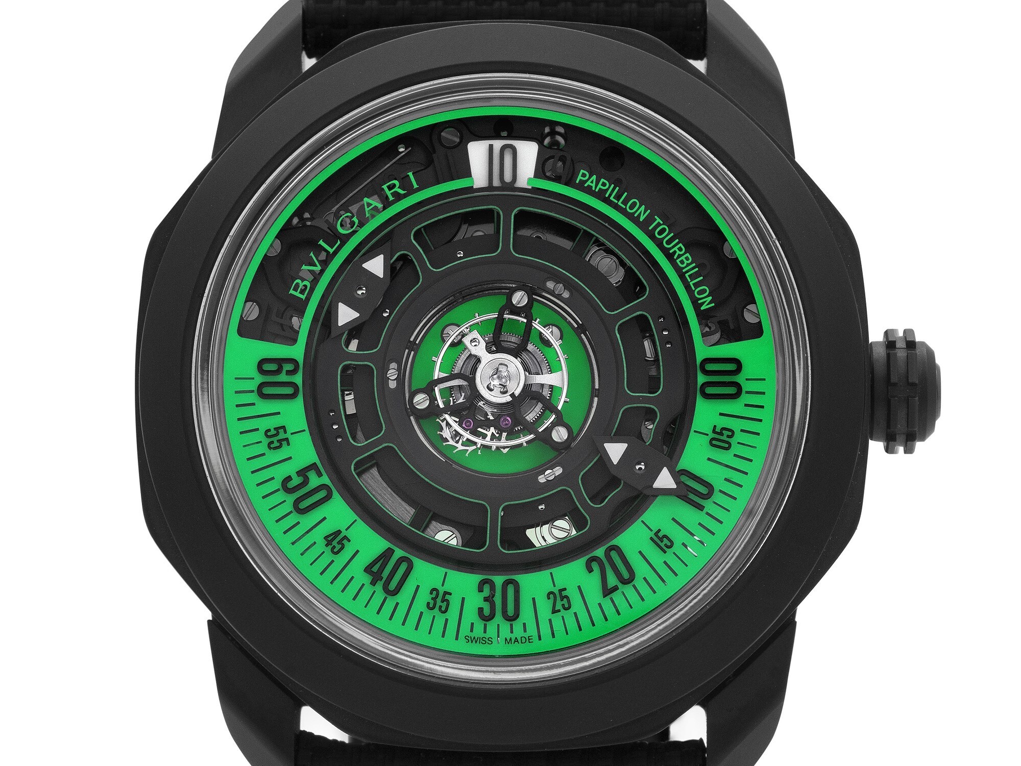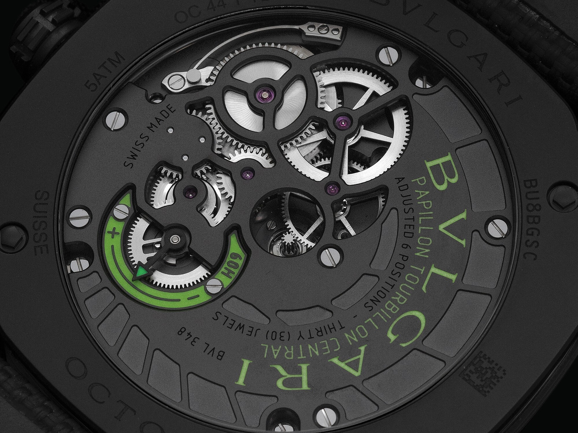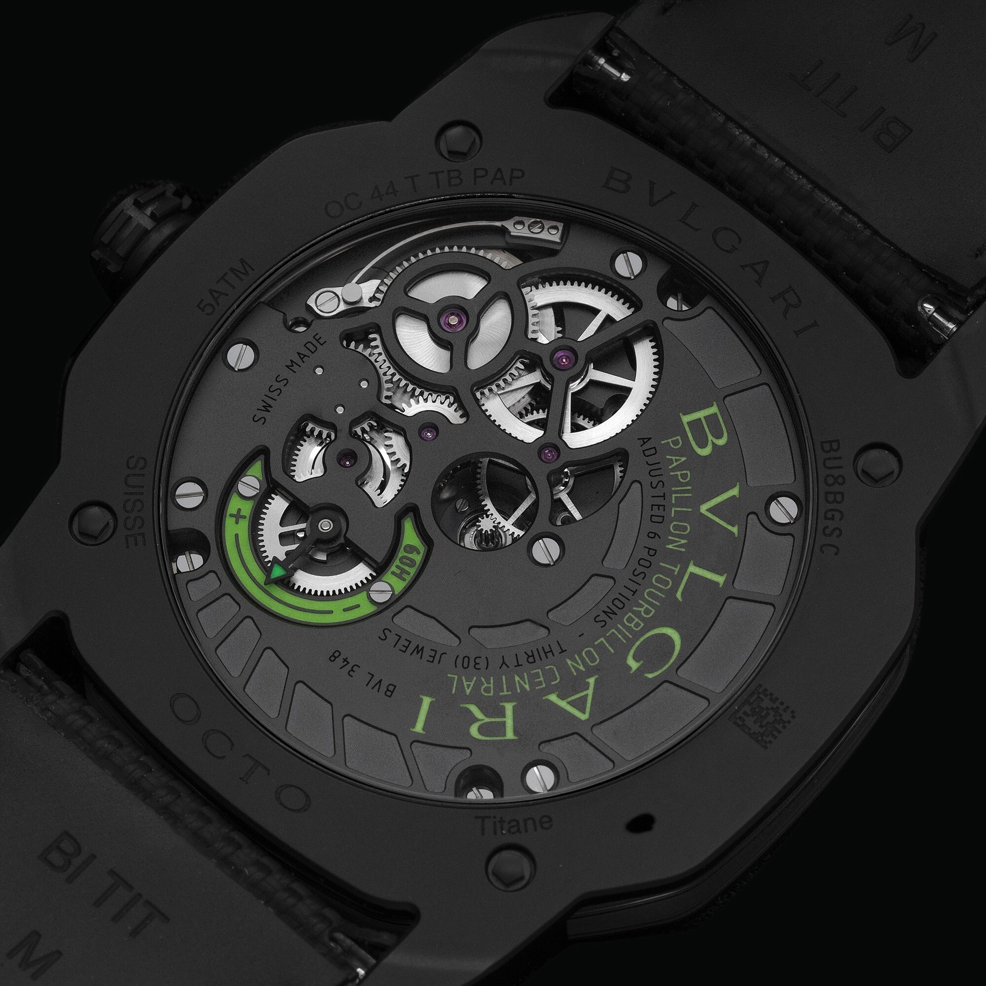 Powering the watch is the BVL 332 manual-winding movement. It operates at 21,600 vibrations per hour and provides a 60-hour power reserve. Turning the watch over reveals the movement’s base plate, which emphasizes circular geometric elements. The power reserve indicator and the BVLGARI logo on the back are also highlighted in green.