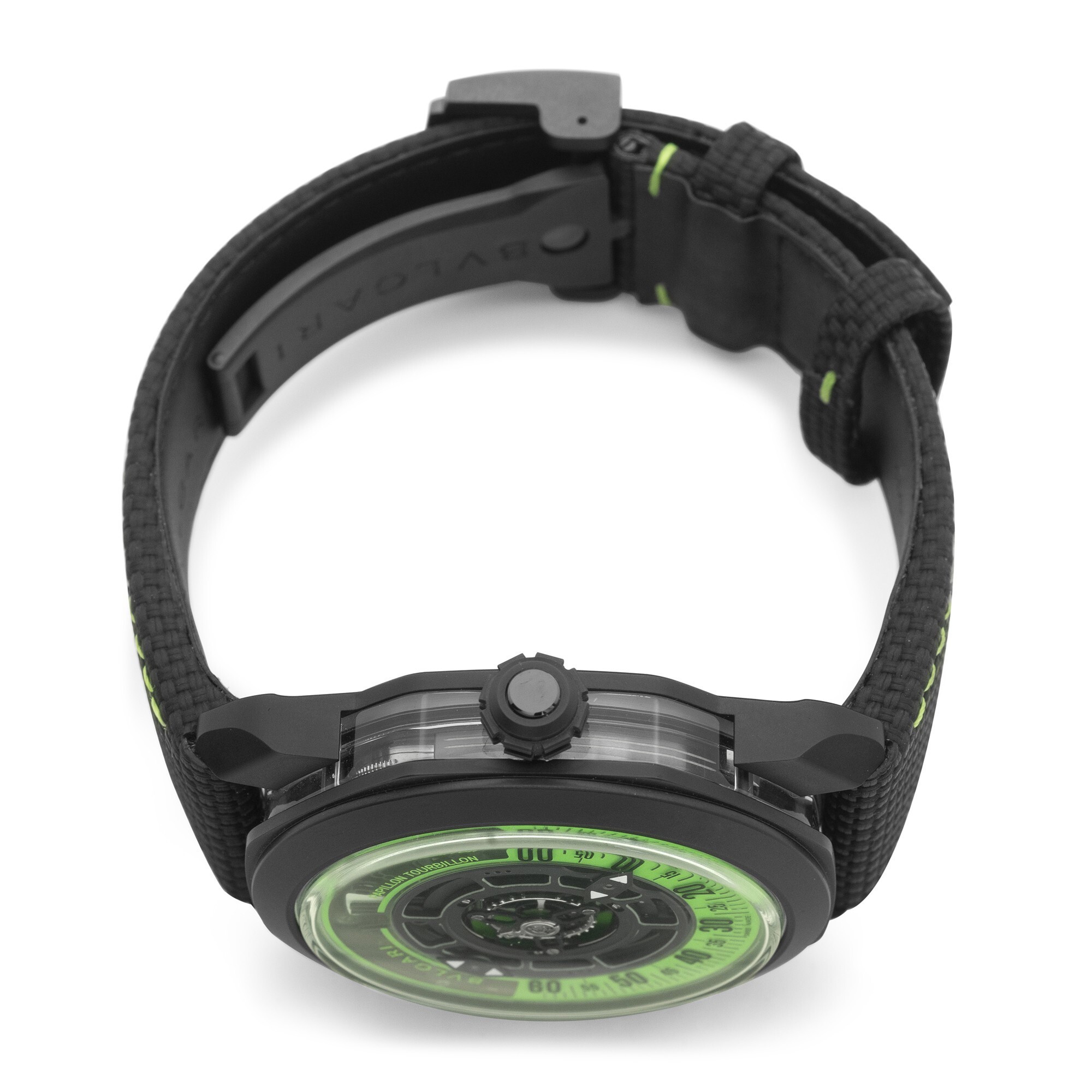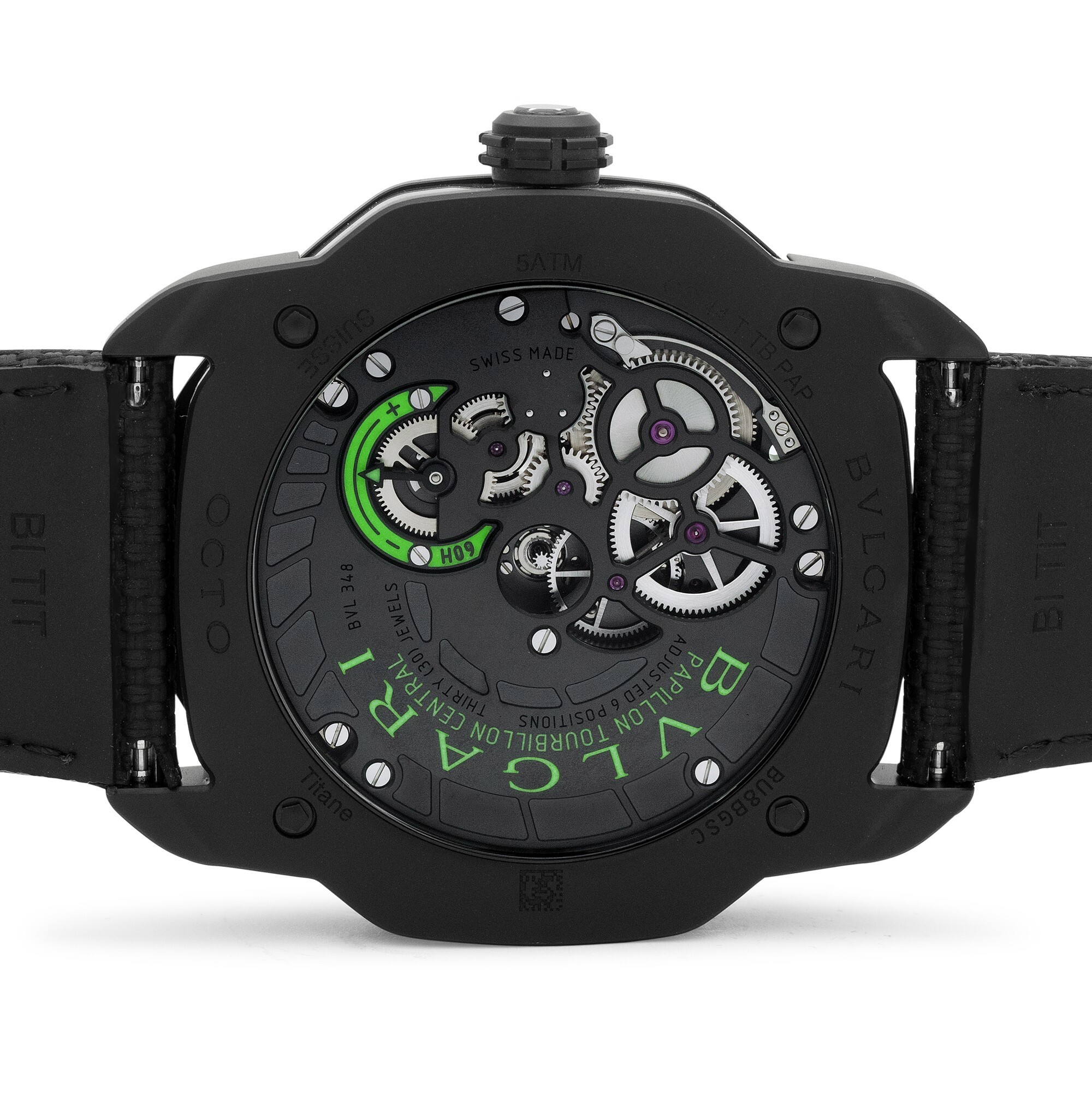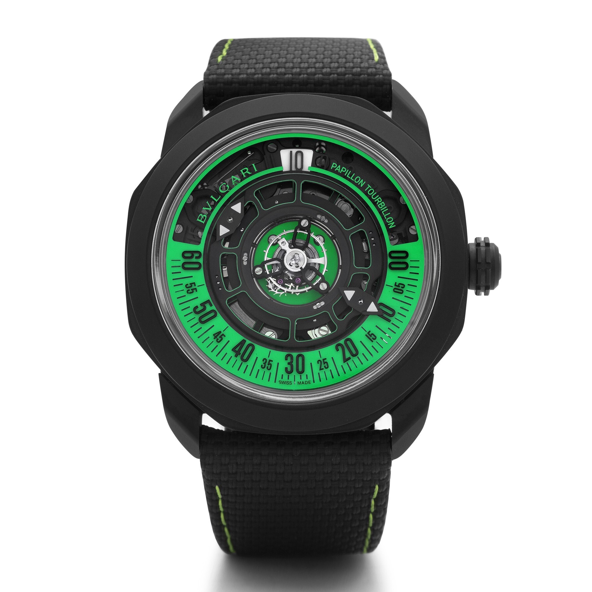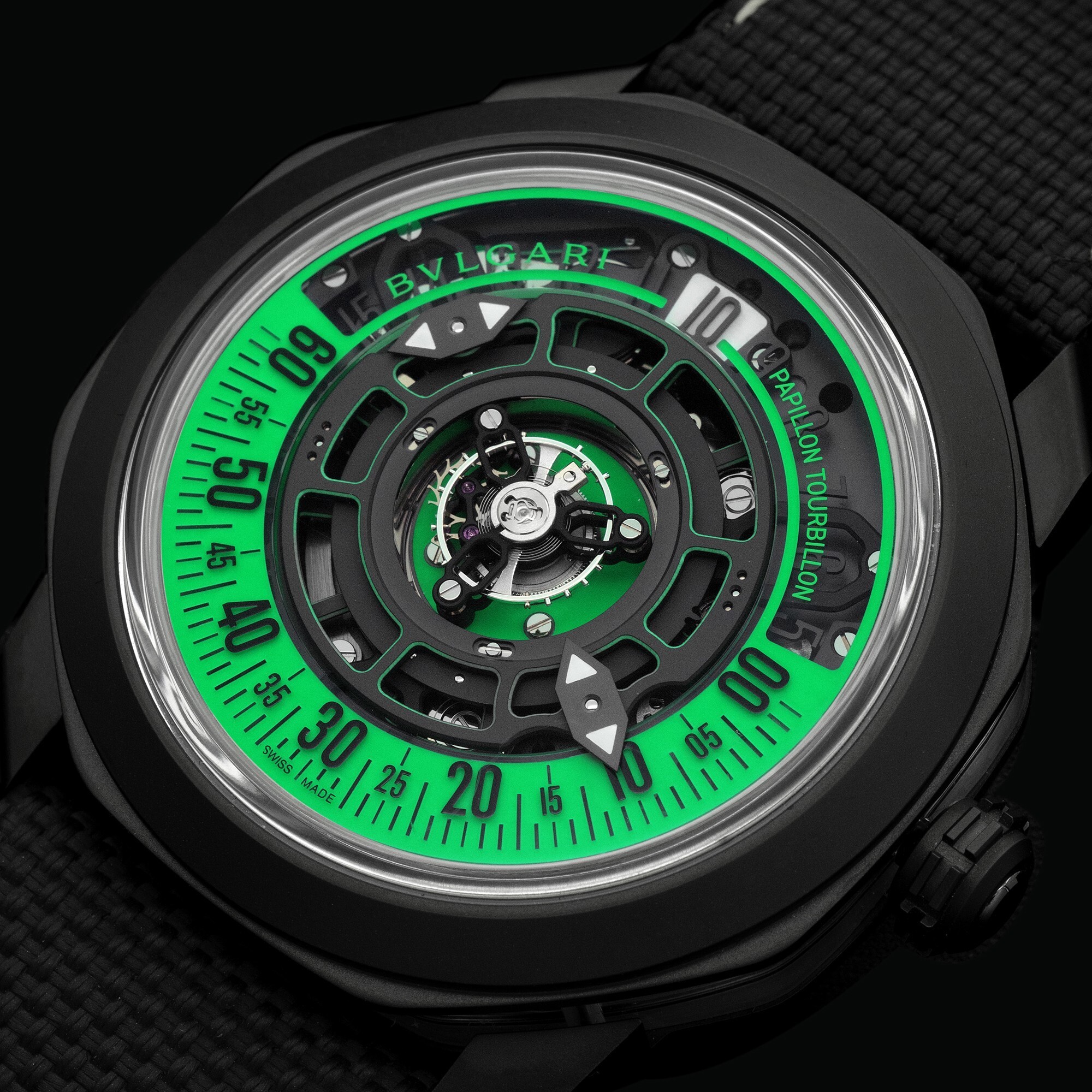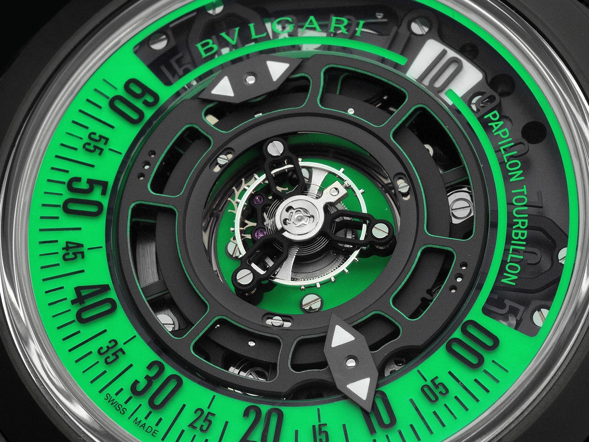 Powering the watch is the BVL 332 manual-winding movement. It operates at 21,600 vibrations per hour and provides a 60-hour power reserve. Turning the watch over reveals the movement’s base plate, which emphasizes circular geometric elements. The power reserve indicator and the BVLGARI logo on the back are also highlighted in green.