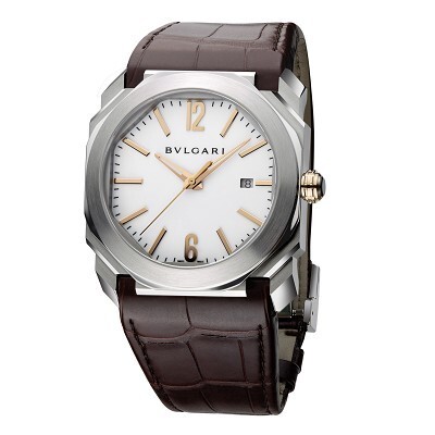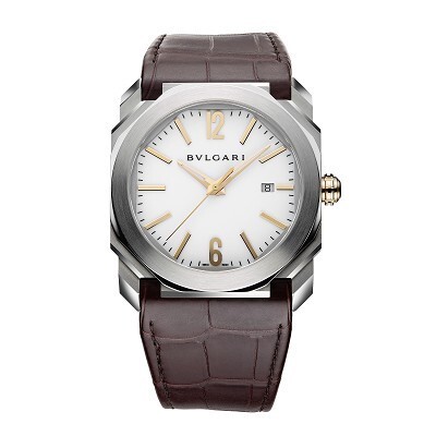 Stainless steel case, 41.5mm in diameter, sapphire crystal glass on the front and back, 18K rose gold screw-down crown with black ceramic inserts, white lacquer dial, rose gold markers, BVL193 automatic winding movement, 28 jewels, dual barrels, 50-hour power reserve, brown alligator leather strap with folding clasp, water-resistant to 100 meters.