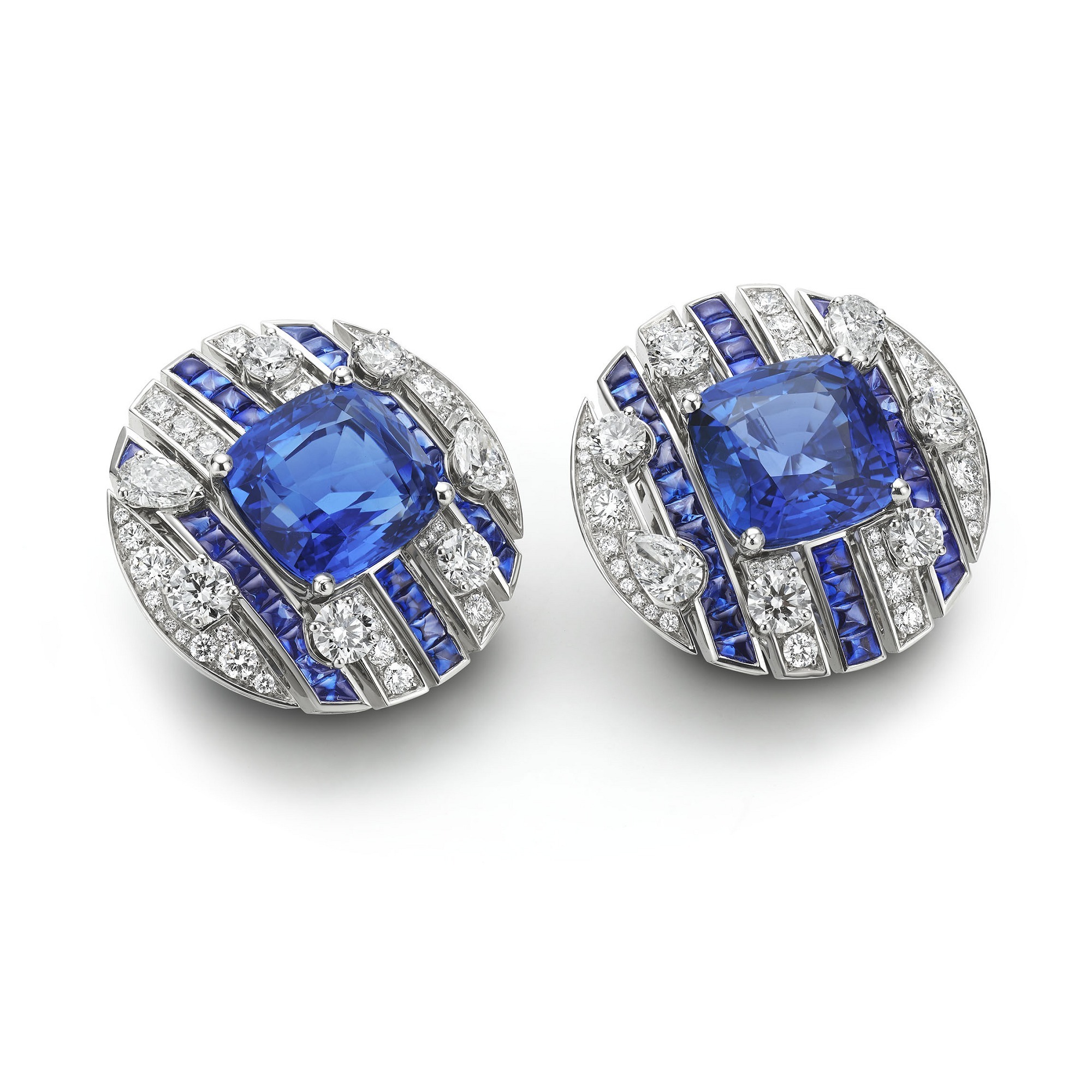The earrings cleverly adopt a rounded medallion shape, prominently set with a central cushion-cut sapphire. Its vivid color is reminiscent of the blue cloak of the Virgin Mary in the classic painting “Virgin Annunciate” by the Italian Renaissance artist Antonello da Messina.