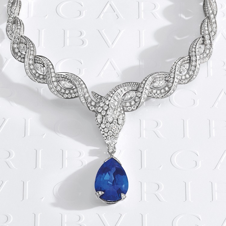 This Serpenti Ocean Treasure necklace is a new creation from BVLGARI’s 2022 Eden The Garden of Wonders High Jewelry collection. Faithful to the brand’s iconic Serpenti theme, it highlights the serpent’s graceful curves, with a pear-shaped sapphire suspended beneath the serpent’s head, exuding a captivating and mysterious charm.