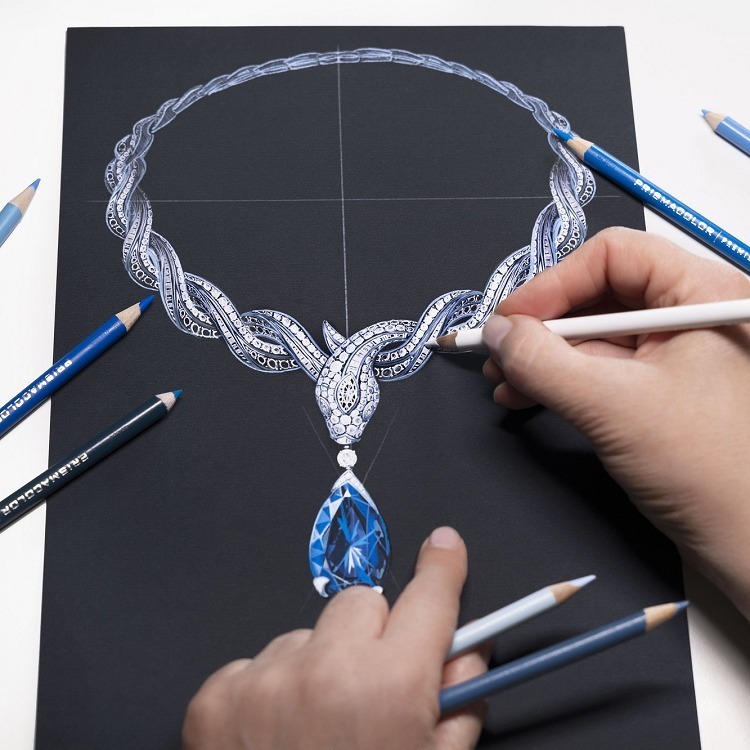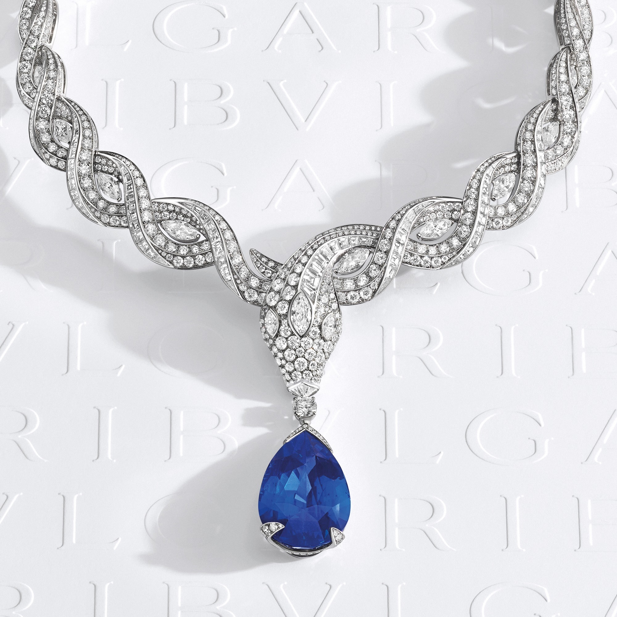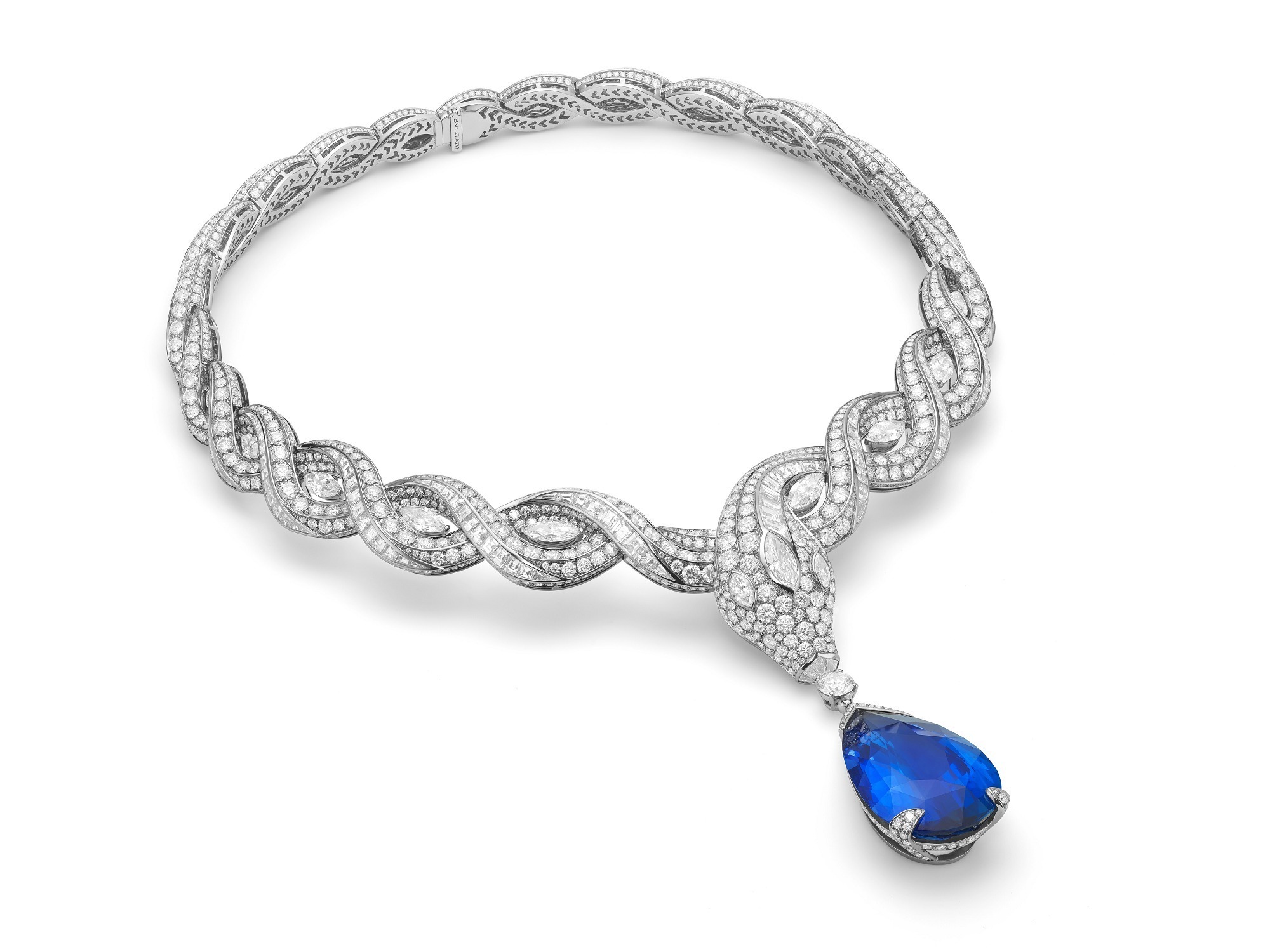 The centerpiece of the creation is a remarkable 61.30-carat pear-cut sapphire of Sri Lankan origin. Its deep and intense blue hue evokes the image of the treasure-filled deep sea, which inspired the necklace’s name, “Ocean Treasure.”