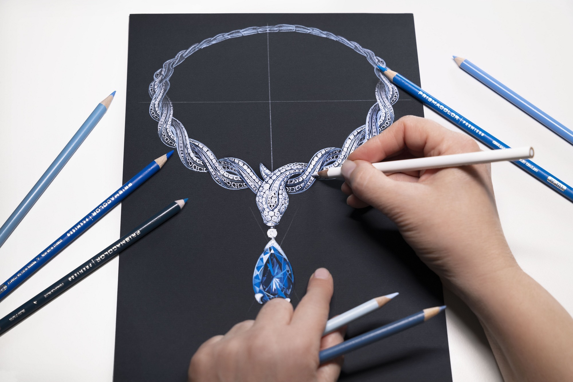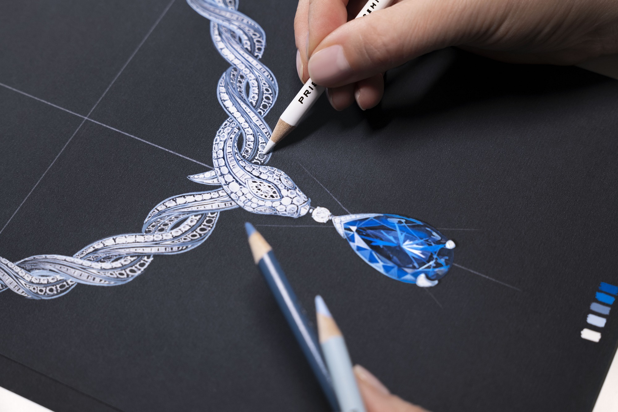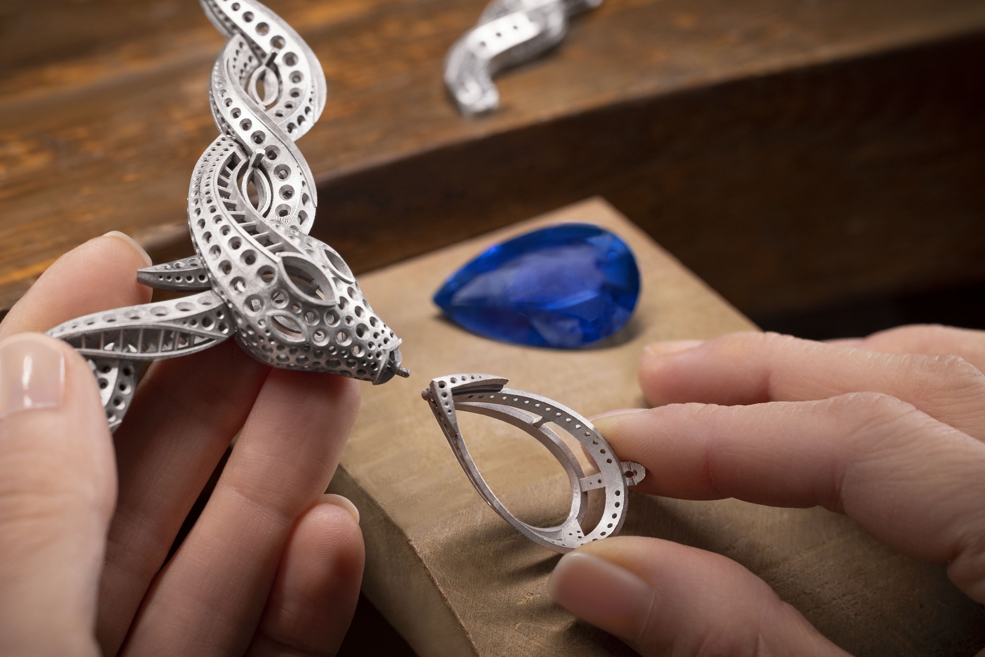 The centerpiece of the creation is a remarkable 61.30-carat pear-cut sapphire of Sri Lankan origin. Its deep and intense blue hue evokes the image of the treasure-filled deep sea, which inspired the necklace’s name, “Ocean Treasure.”