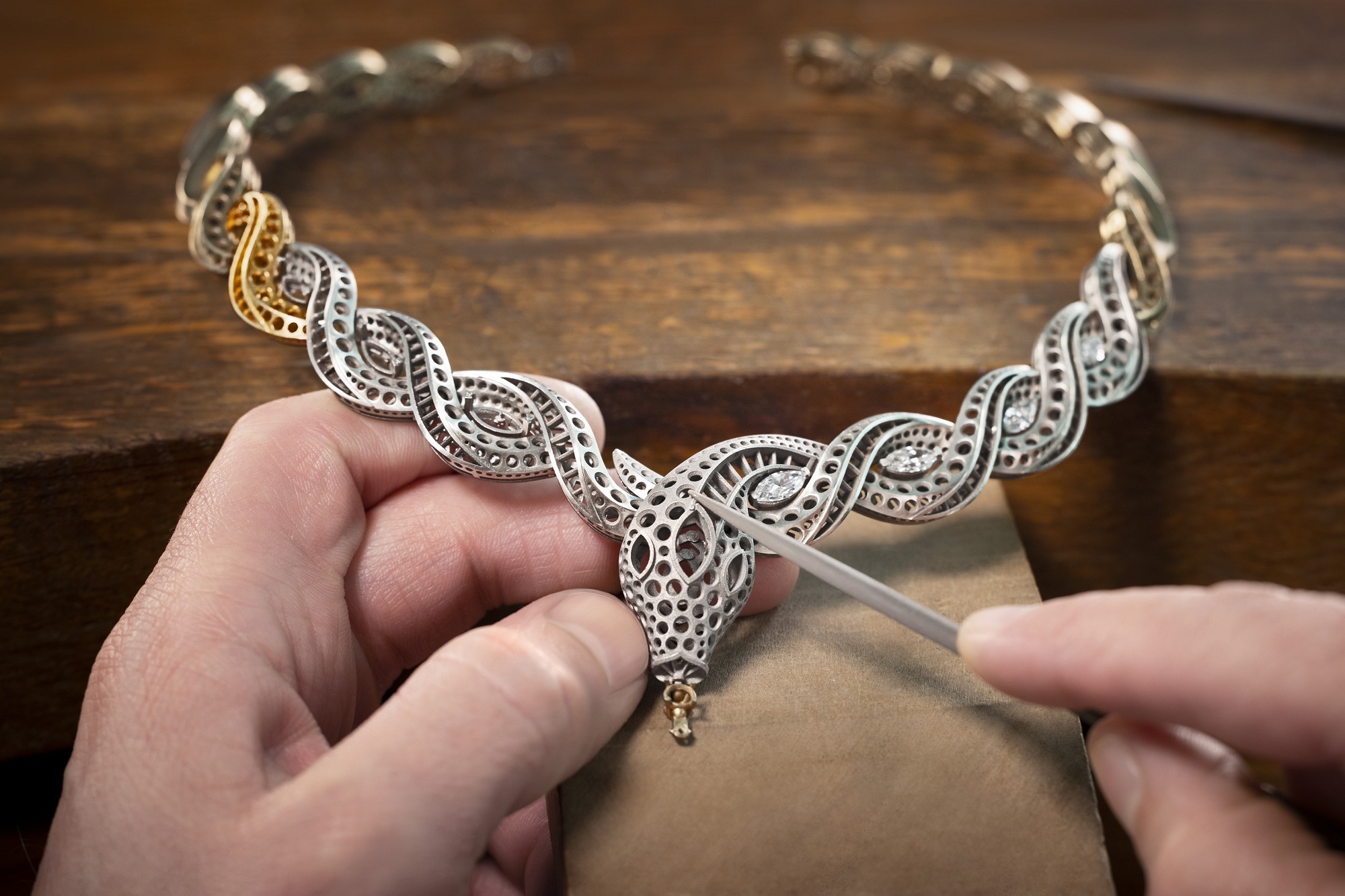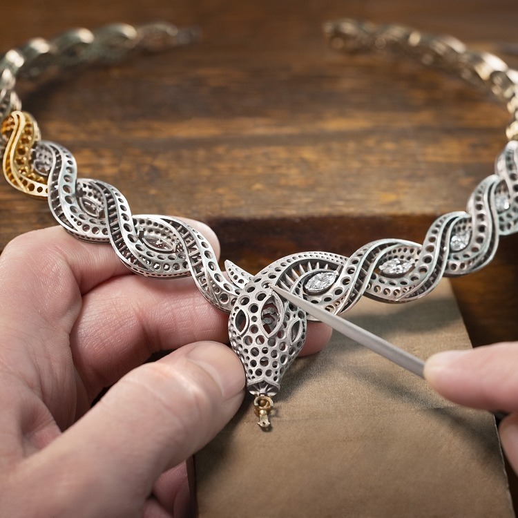 The entire necklace is crafted in platinum, coiling elegantly around the neck like a serpent. The serpent’s body is depicted through sinuous and interlaced forms, achieving remarkable three-dimensionality through double-row diamond setting: