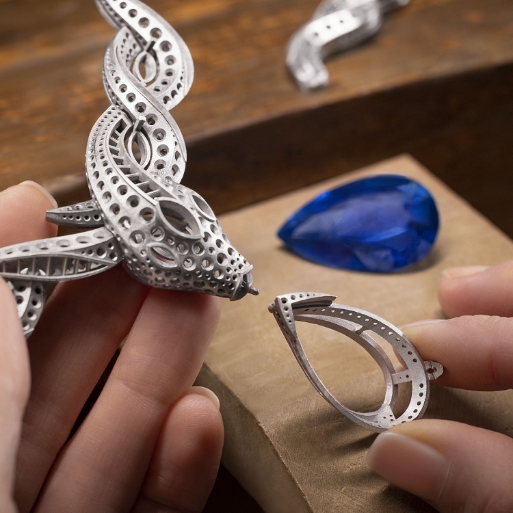 The spaces within the serpent’s body are accentuated with marquise-cut diamonds, creating a light, seemingly suspended effect.