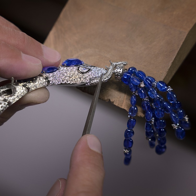 The serpent’s head showcases intricate detailing: from its subtly extended, coiled tongue hangs a fringe of 80 sapphire beads weighing 116.01 carats, conjuring the mesmerizing image of a serpent gliding through ocean depths. The piece exudes a mysterious and alluring aura. The diamond-setting craftsmanship is exceptionally complex, utilizing brilliant-cut diamonds of varying sizes to enhance the sapphires’ vivid color. The necklace required 1,400 hours of meticulous artistry to complete.