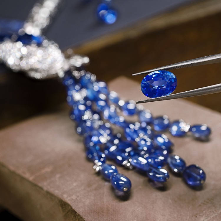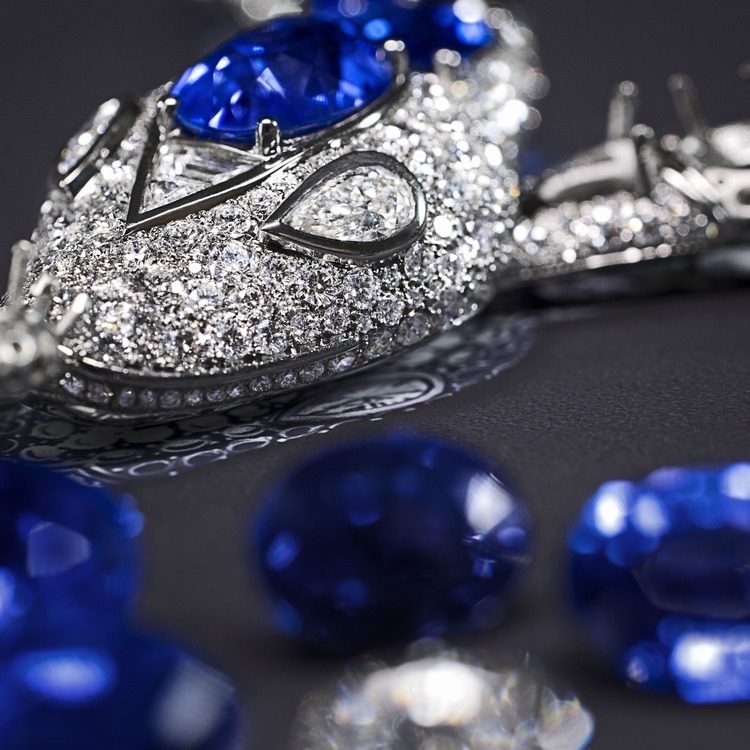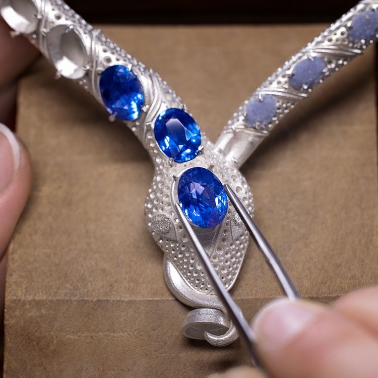 Crafted in platinum, the serpentine form coils elegantly around the neck. The serpent’s body and head are pavé-set with diamonds, creating a dazzling interplay of light. The most striking feature is the nine oval-cut sapphires, totaling 40.81 carats, all certified as Sri Lankan origin. Set sequentially from the head to the body, they resemble mysterious and enchanting scales.