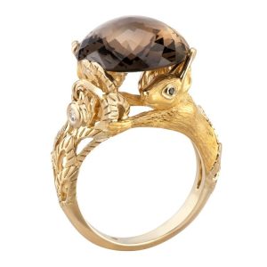This charming squirrel-shaped ring is a creation by Spanish jeweler Carrera y Carrera, part of its Savia collection. It features a rose-cut smoky quartz as the central stone, chosen to evoke the warm, natural hue of a pinecone.