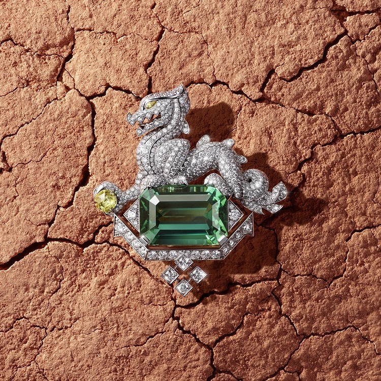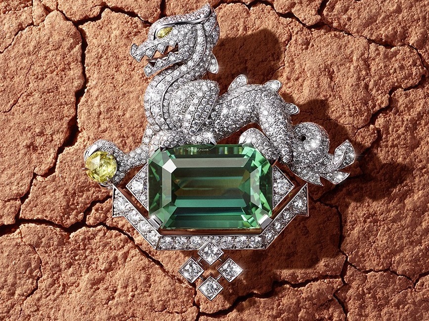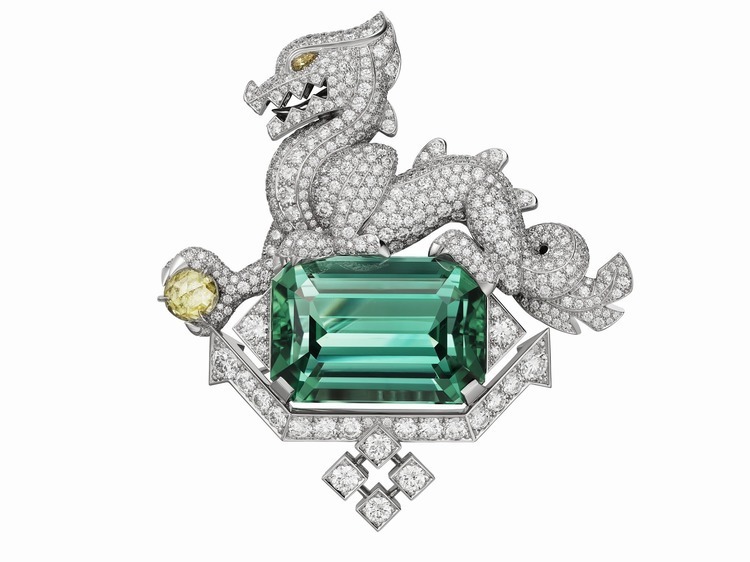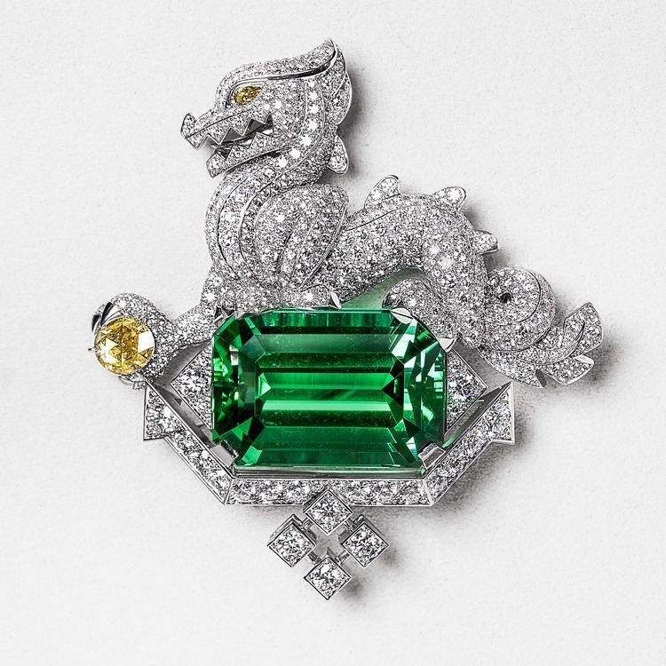 The upper part of the brooch masterfully portrays a white dragon in a regal profile stance, meticulously sculpted in white gold and fully pavé-set with diamonds. One of its formidable claws clutches a splendid fancy yellow diamond, evoking the gesture of safeguarding a cherished jewel. Intriguingly, the dragon’s facial expression carries nuances reminiscent of Western dragon imagery, artfully merging the creative essence of both Eastern and Western cultural traditions.