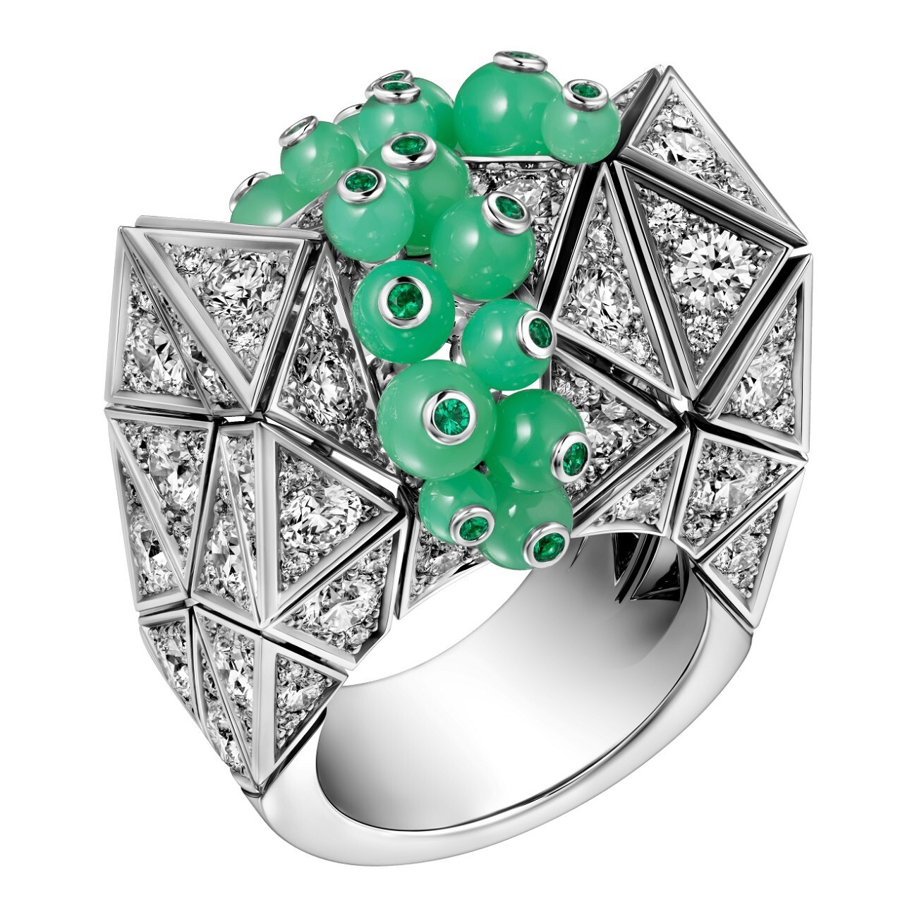 There is a pedicle, and the fresh green tone becomes more vibrant with the fire of diamonds; another ring features