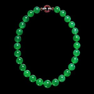 This exceptional jadeite bead necklace remains the most valuable jadeite jewel ever sold at auction, composed of 27 old-mine imperial jadeite beads from the late Qing Dynasty. Each bead is of extraordinary translucency and vivid emerald-green hue, meeting the highest standards of jadeite quality. The largest bead measures 19.2 mm in diameter, while the smallest is 15.4 mm — a rare size range for old-mine jadeite, making the creation of such a perfectly matched necklace extraordinarily difficult, often requiring three times as many jadeite beads to select a complete strand.