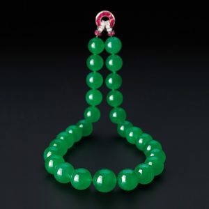 This exceptional jadeite bead necklace remains the most valuable jadeite jewel ever sold at auction, composed of 27 old-mine imperial jadeite beads from the late Qing Dynasty. Each bead is of extraordinary translucency and vivid emerald-green hue, meeting the highest standards of jadeite quality. The largest bead measures 19.2 mm in diameter, while the smallest is 15.4 mm — a rare size range for old-mine jadeite, making the creation of such a perfectly matched necklace extraordinarily difficult, often requiring three times as many jadeite beads to select a complete strand.