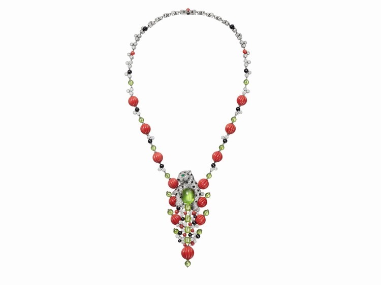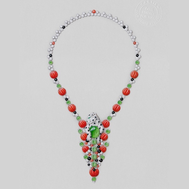 The collar section alternates strands of coral beads, onyx beads, peridot beads, and round diamonds, skillfully incorporating Cartier’s signature red, green, and black color scheme to accentuate the panther’s sharp and proud demeanor.