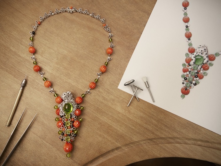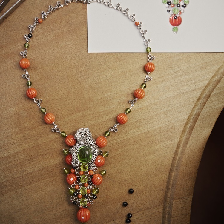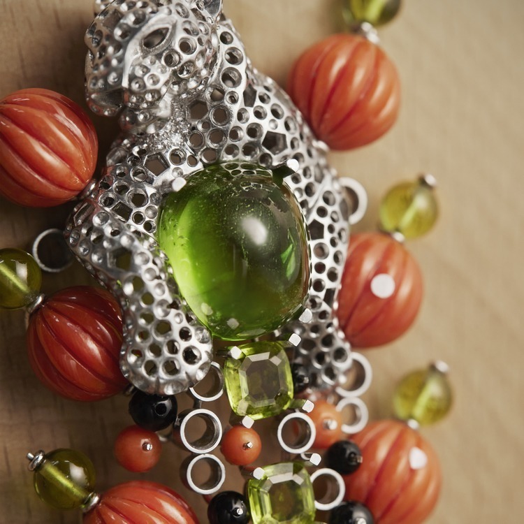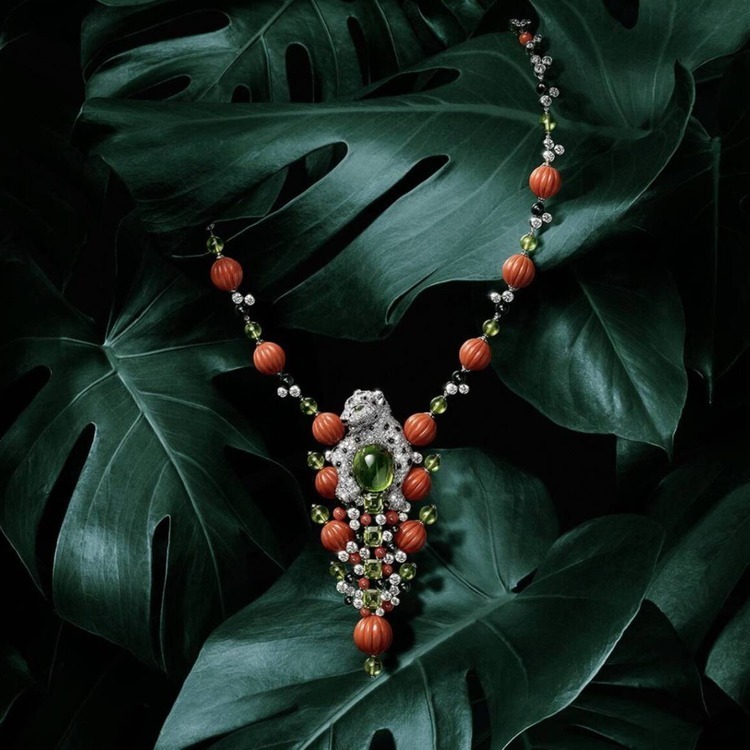 This high jewelry necklace is from Cartier’s 2024 “Le Voyage Recommencé” collection. It masterfully blends realistic and abstract techniques to interpret the iconic “Panthère” (Panther) theme. The designer specifically chose cabochon-cut peridots paired with carved coral beads, paying homage to the significant role of Mughal-style jewelry in the brand’s history.