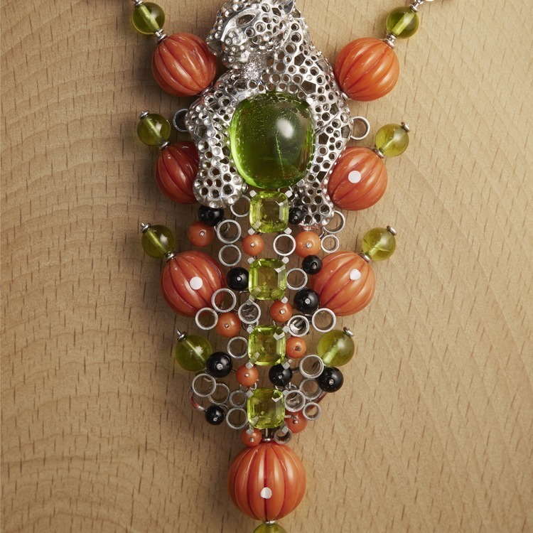 The center of the necklace vividly depicts a panther with black spots. Its eyes are set with emeralds, and the spots are inlaid with onyx. Between the panther’s two front paws rests a 26.52-carat cabochon-cut peridot, as if it were guarding a precious treasure. The panther’s body then extends into an abstract pattern of diamonds and onyx beads.