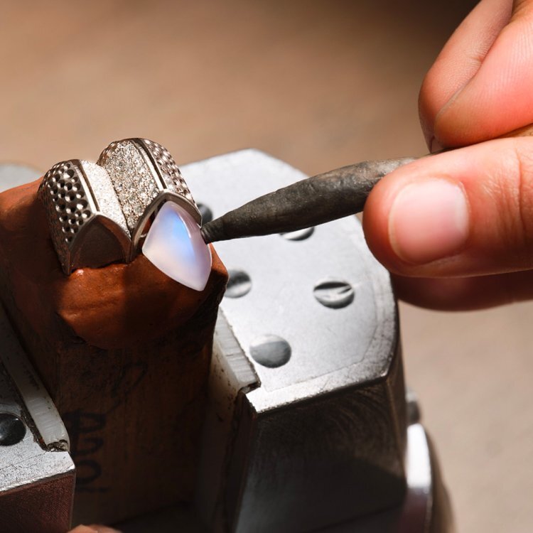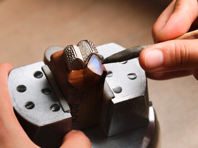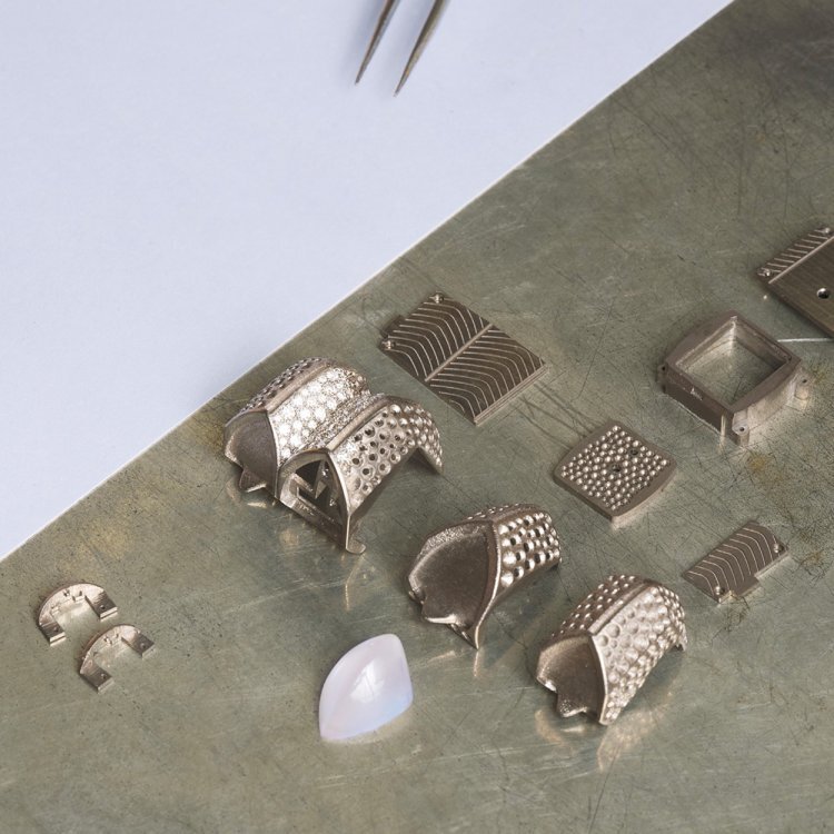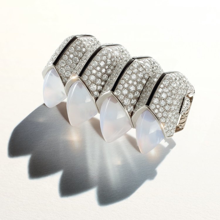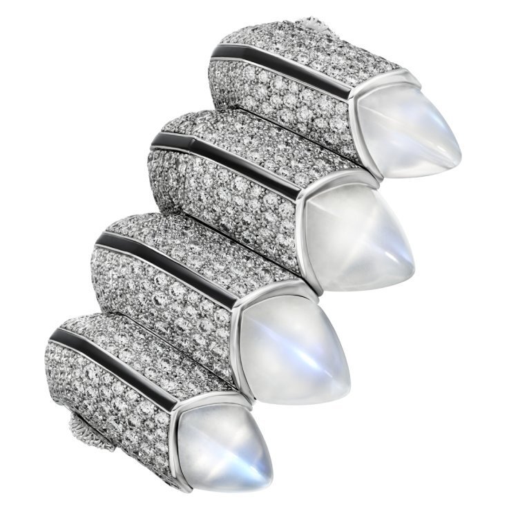 The designer sculpted the four panther toes in white gold, pavé-set with diamonds. Black onyx lines accentuate the structure of the paw, while four custom-cut moonstones at the tips form the claws, their natural iridescence resembling gleaming blades.