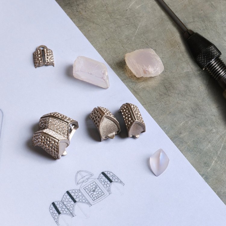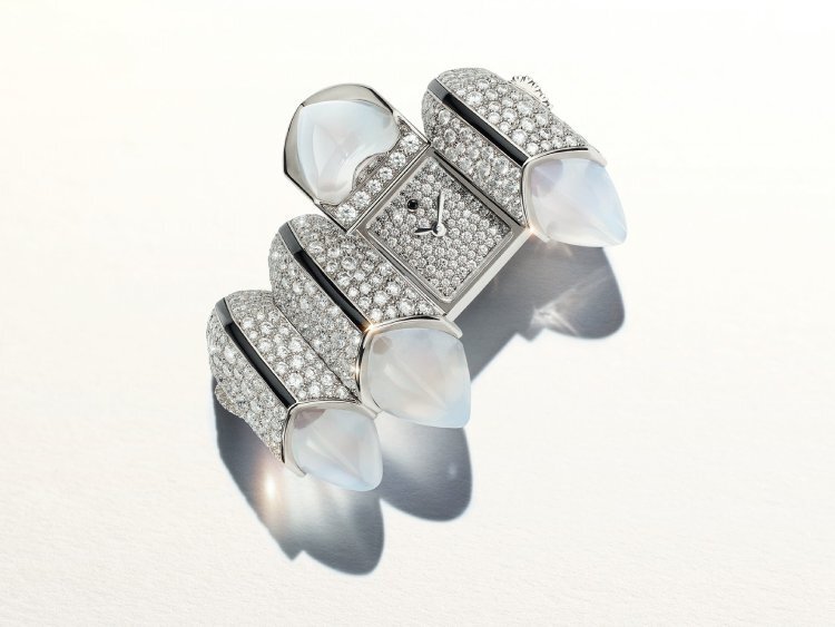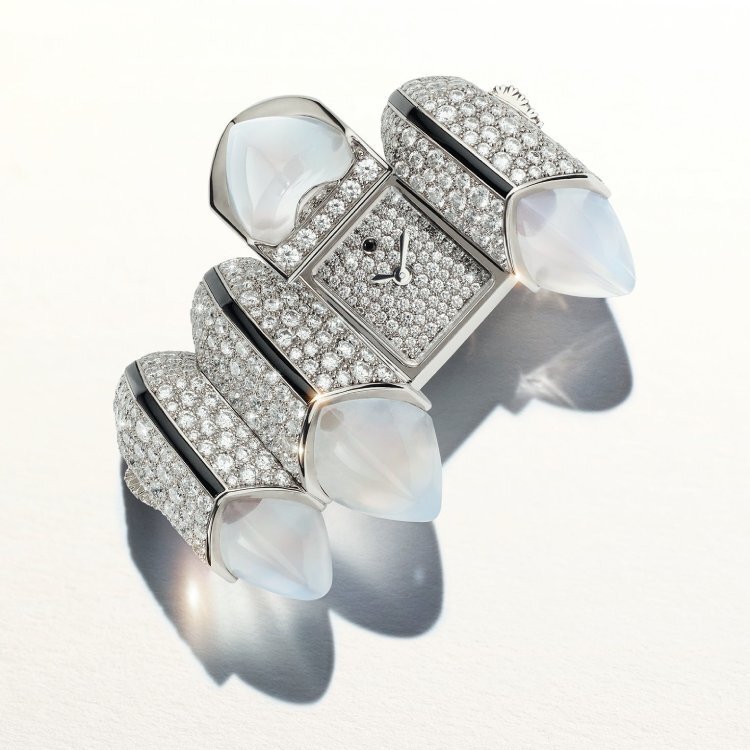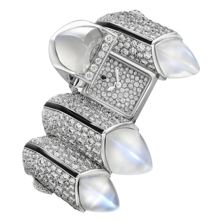 Hidden beneath the panther’s paw lies a secret watch mechanism: by gently pressing the second moonstone “claw,” the snow-set diamond dial is revealed. The minimalist two-hand display exudes refined charm, with a single onyx cabochon marking the 12 o’clock position.