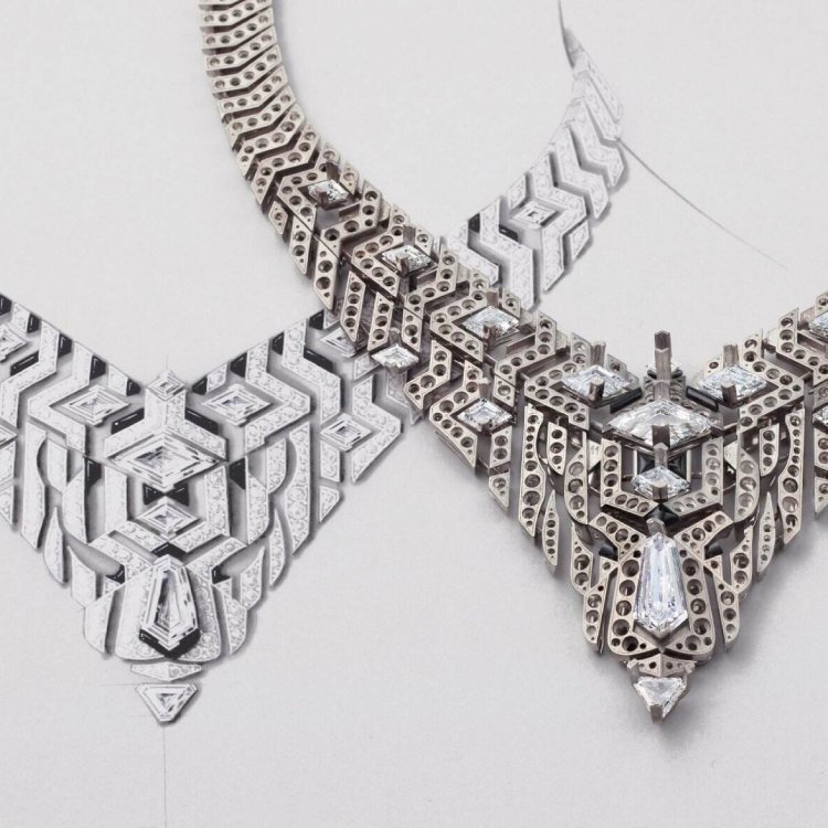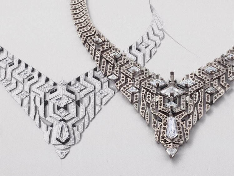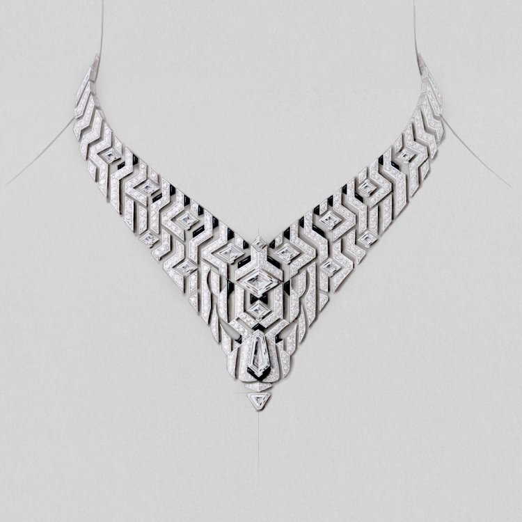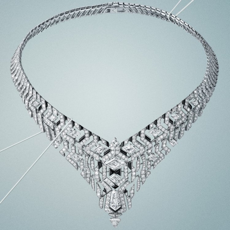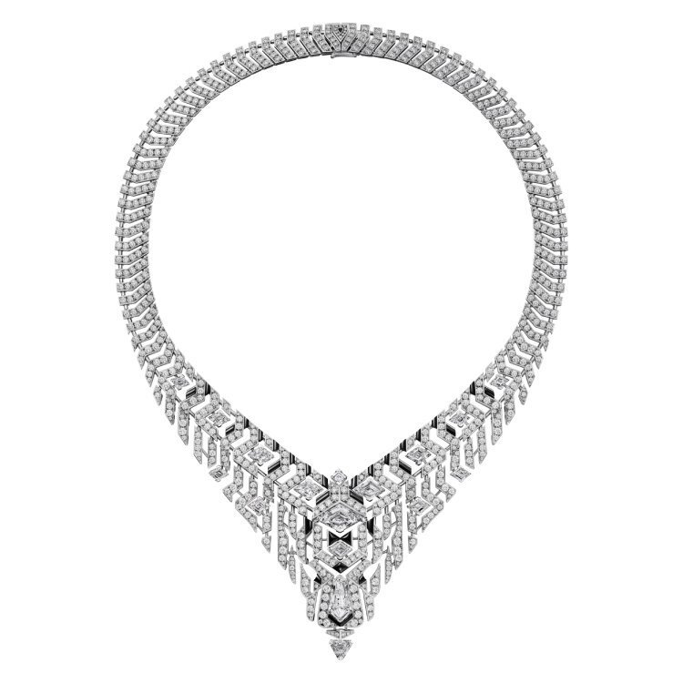 Crafted in white gold and set with diamonds, the necklace’s intricate lattice of intersecting lines creates a striking optical illusion. The openwork design enhances its airy, skin-like transparency, while the perfectly symmetrical structure evokes a sense of modern architectural beauty. Along the chain, custom-cut onyx stones accentuate Cartier’s signature black-and-white color harmony—timeless, bold, and sophisticated.