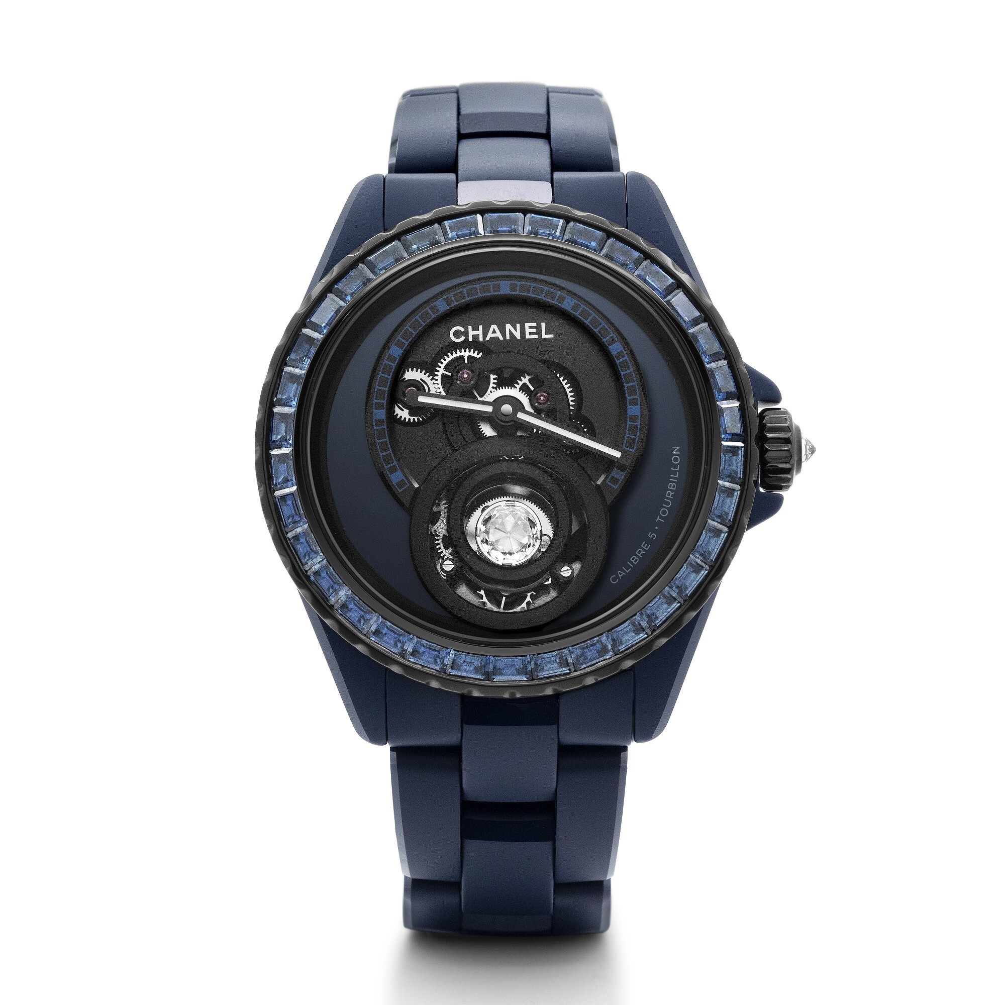 Matte blue high-tech ceramic case, 38 mm diameter,Black-coated stainless-steel bezel set with 34 baguette-cut blue sapphires,Black-coated stainless-steel crown set with a brilliant-cut diamond,Sapphire crystal,Blue openworked dial with black hands,Caliber 5 hand-wound floating tourbillon movement,29 jewels, 28,800 vph, approximately 42-hour power reserve,Matte blue high-tech ceramic bracelet with black-coated stainless-steel folding clasp,Water-resistant to 50 meters.