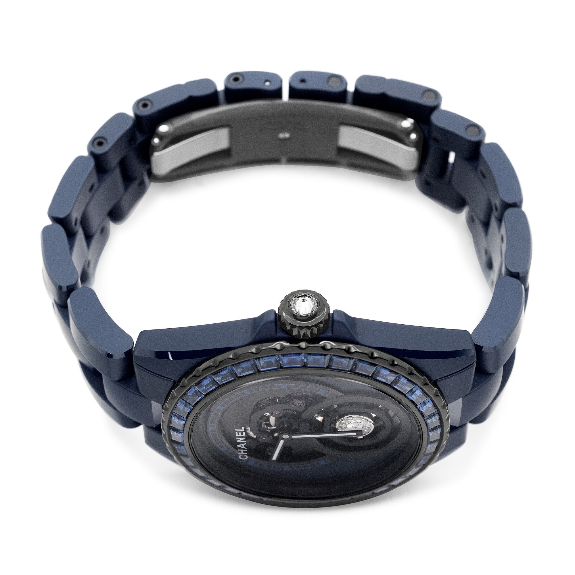 The 38 mm case is crafted from matte blue highly resistant ceramic, paired with a black-coated stainless-steel bezel and crown. The bezel is set with 34 custom-cut baguette blue sapphires, while the crown is adorned with a brilliant-cut diamond—a subtle yet radiant accent.