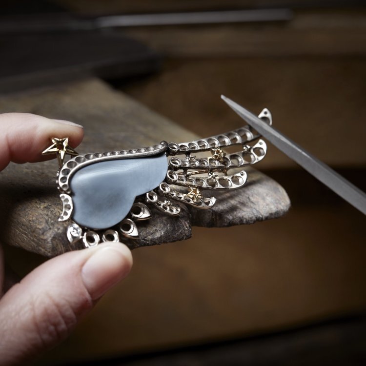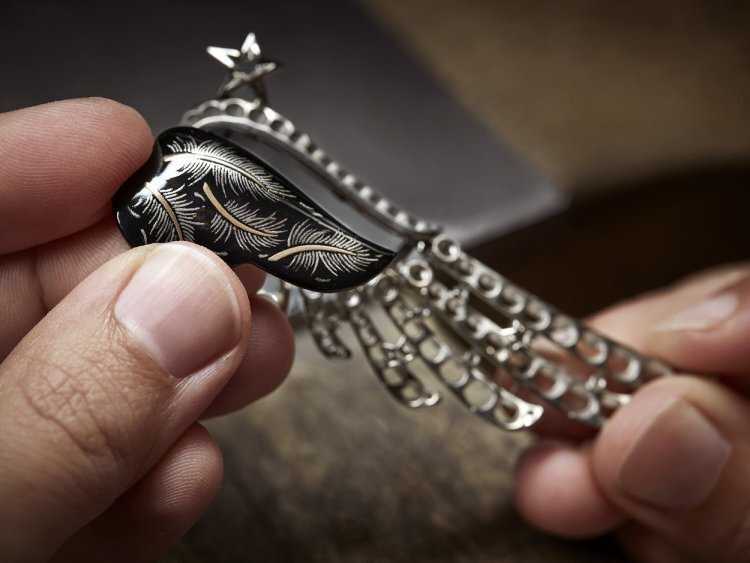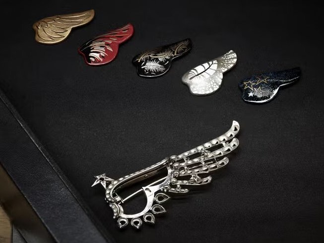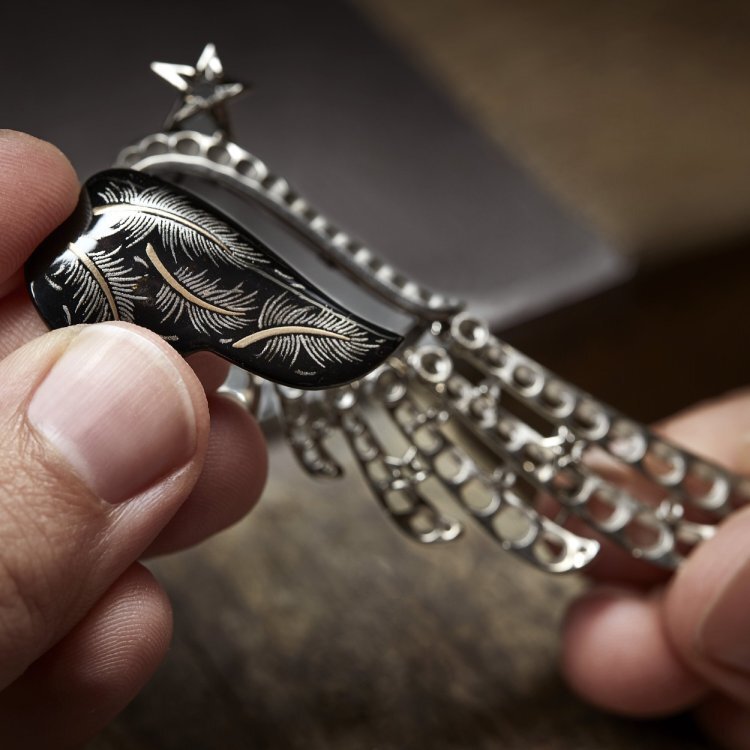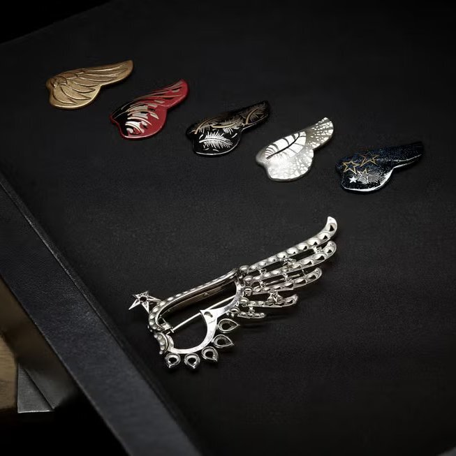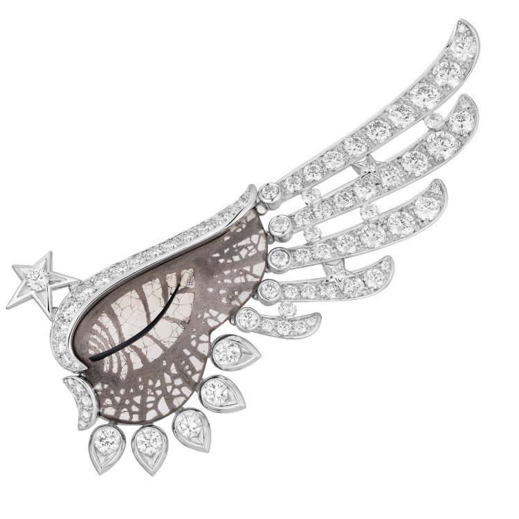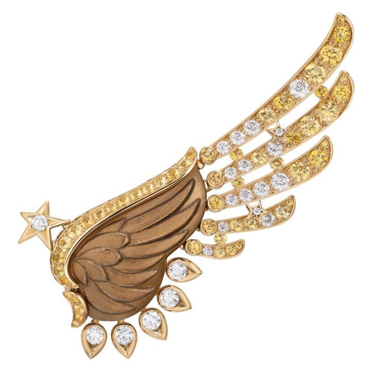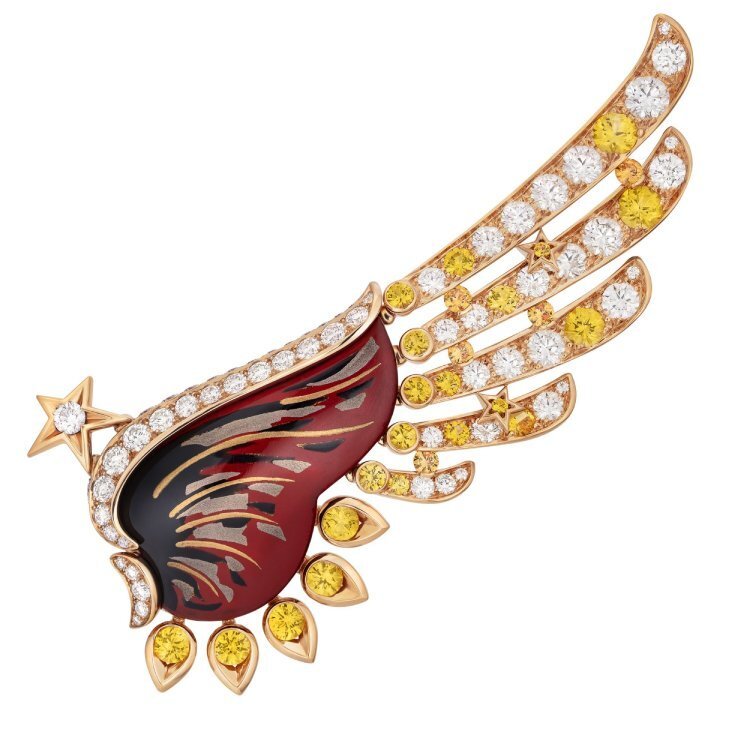 The Chanel Five Wings Maki-e Brooch Set from the 2025 Reach for the Stars high jewelry collection celebrates a poetic fusion of two artistic traditions—gem-setting and Japanese Maki-e lacquer art. Each brooch takes the form of a feathered wing, where precious metals and gemstones are intricately combined with hand-painted lacquer designs depicting comets, fine feathers, and delicate leaves, evoking both grace and celestial beauty.