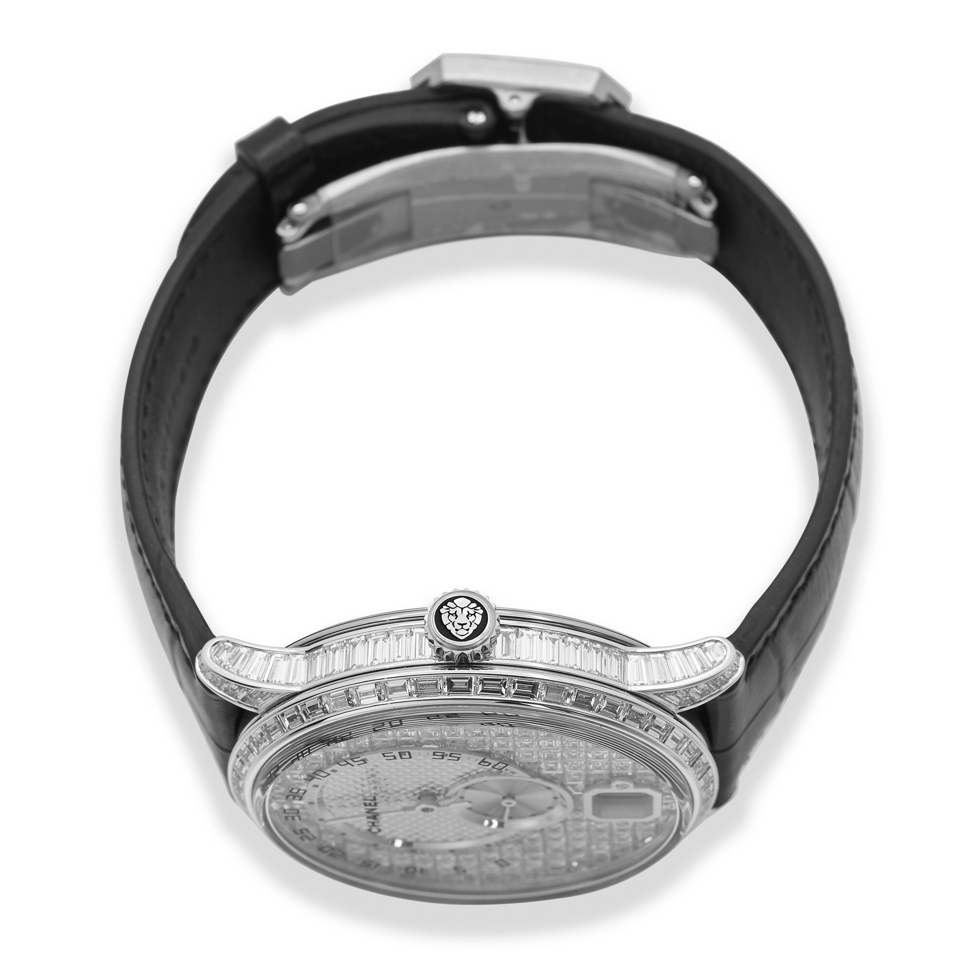 This Monsieur de Chanel High Jewelry edition jumping hour watch is set with nearly 300 diamonds with a total weight of approximately 11 carats. Its most distinctive feature is the exclusive use of baguette-cut diamonds, allowing this dazzling jeweled timepiece to retain a masculine character.