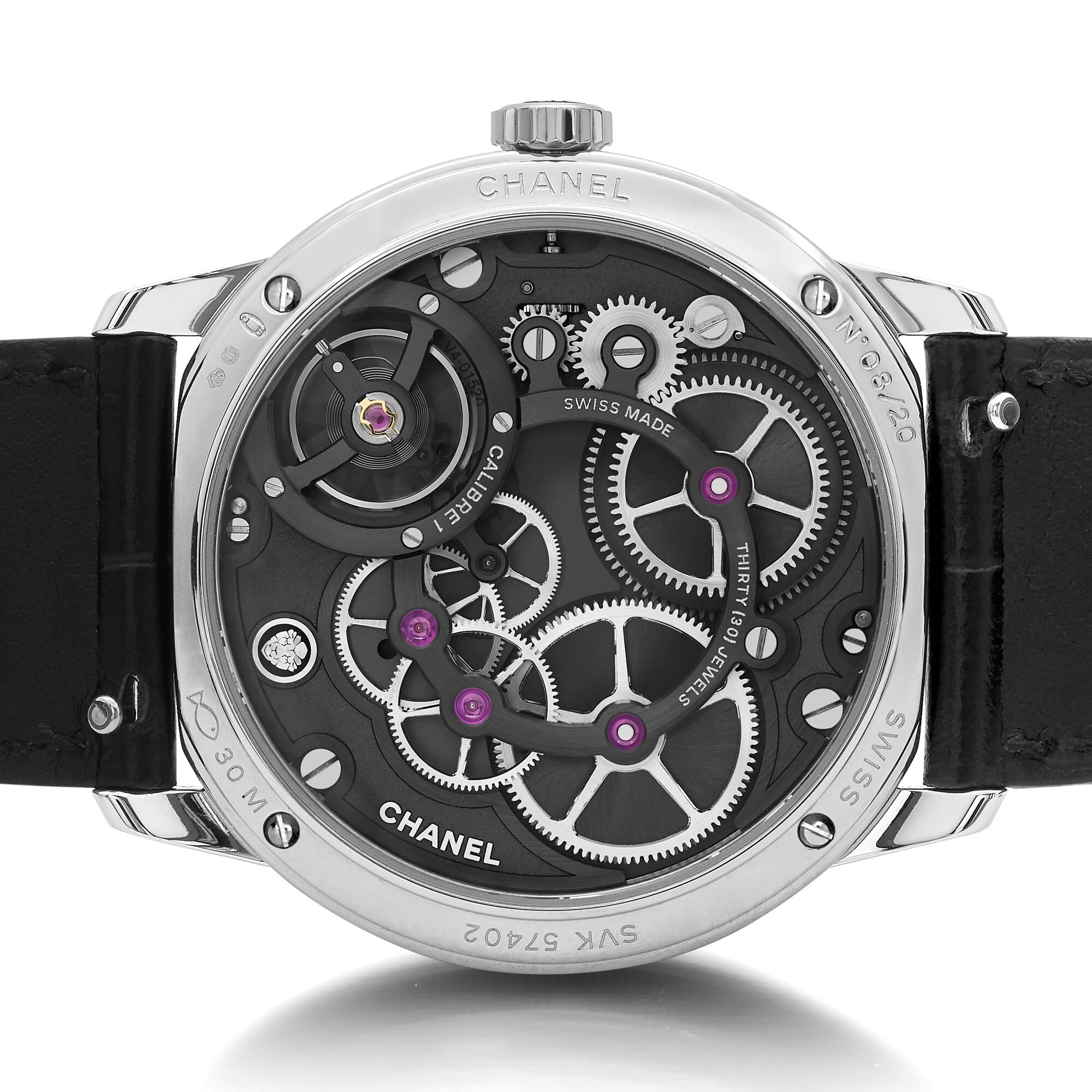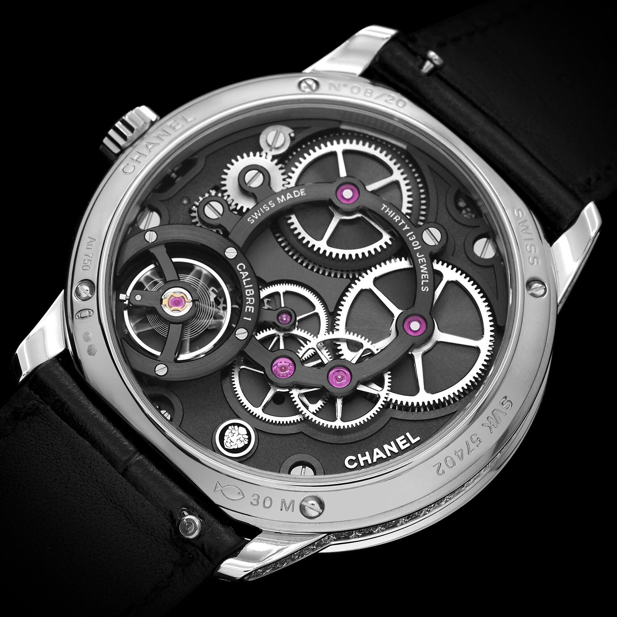 The 40mm white gold case houses the in-house Caliber 1 manual-winding movement. Beating at 28,800 vibrations per hour and powered by twin barrels, it offers a 72-hour power reserve. This movement, developed by Chanel in collaboration with independent watchmaker Romain Gauthier, comprises 170 components. The movement bridges and gears feature an elegant openworked design, offering an architectural beauty when viewed through the caseback. It is water-resistant to 30 meters.