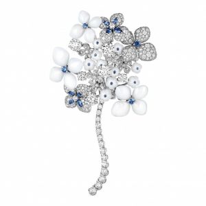 As part of its Hortensia High Jewelry collection, Chaumet introduces the Voie Lactée brooch, a poetic interpretation of the Maison’s iconic hydrangea motif. The design features petals crafted from carved white chalcedony and pavé-set diamonds, while a deep blue sapphire pistil at the center evokes the serene beauty of a hydrangea garden under a summer night sky.