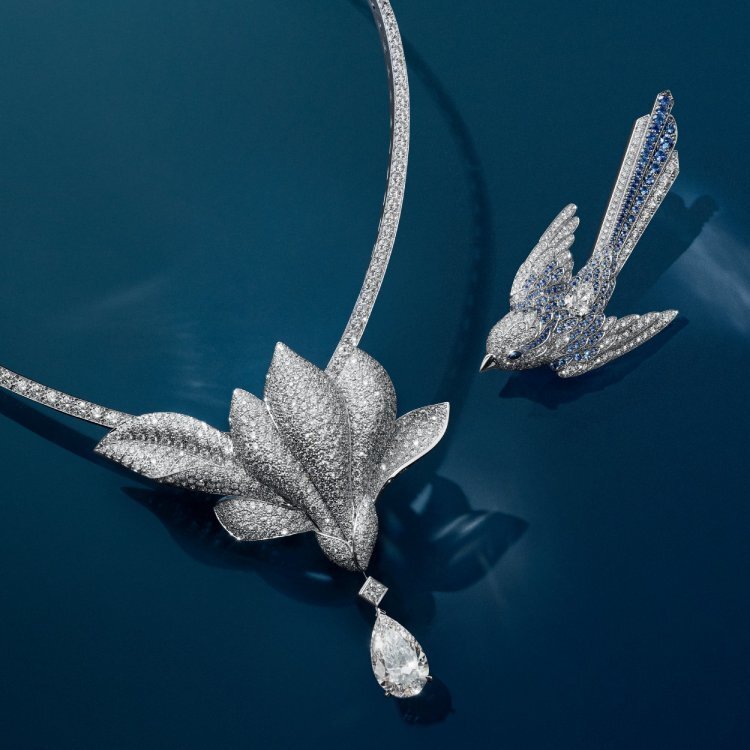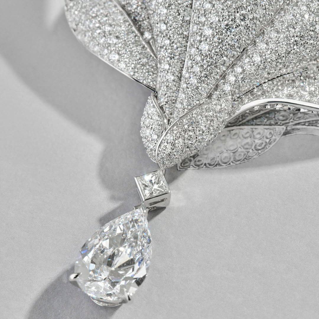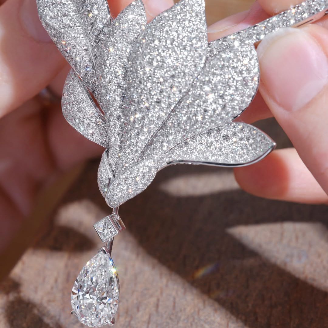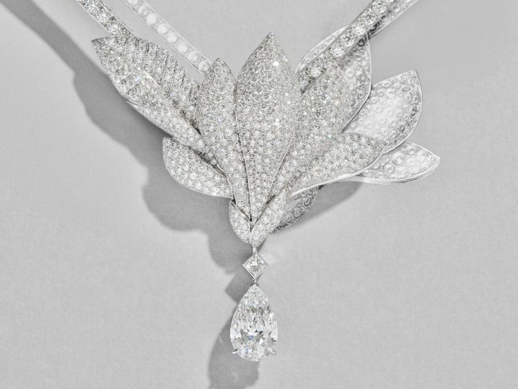 The necklace presents a side-view of the magnolia flower, suspending a 5.26-carat D color, Flawless clarity pear-cut diamond at the bottom. Its creation required 1150 hours of workmanship.