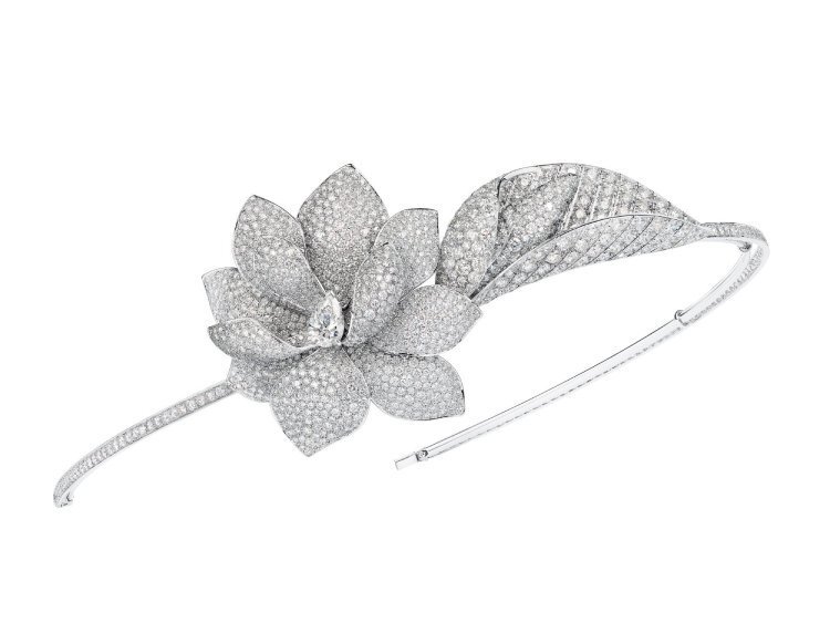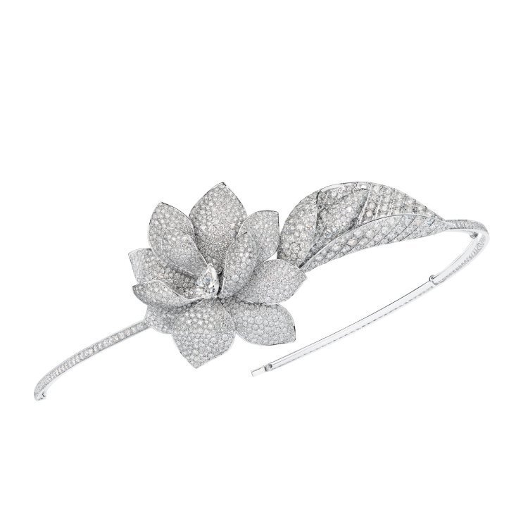 The headpiece features an asymmetrical design, where a luxuriantly blooming magnolia is accompanied by a naturally curling diamond leaf, enveloping a bud to express abundant vitality.