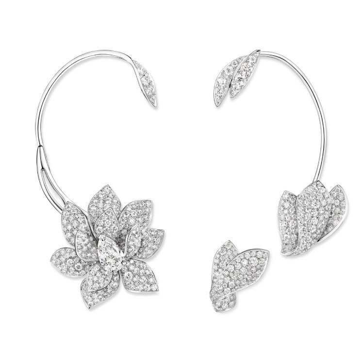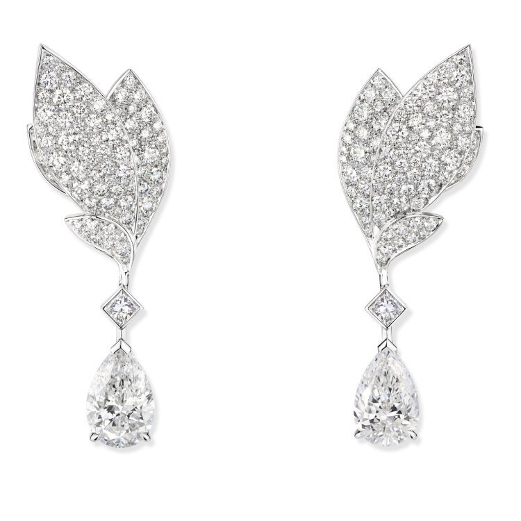 The ear pendants feature a stud formed by four overlapping and sheltering petals, from which two square-cut diamonds and two pear-cut diamonds (totaling 5.03 carats) are suspended, swaying gracefully with the wearer’s movement.